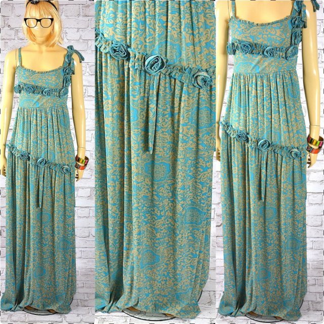 Zjawiskowa długa sukienka w poszerzanym kroju w turkusowo-beżowej kolorystyce w kwiatowe ornamenty ,dodatkowo zdobiona w wyszywane spore róże min przy linii biustu, bioder , oraz przy jednym ramiączku. Sukienka o dość luźnym kroju, wierzchnia część wykonana z mikrosopijnie siateczkowej tkaniny.Posiada podszewkę.Sukienka na wysoką osobę.