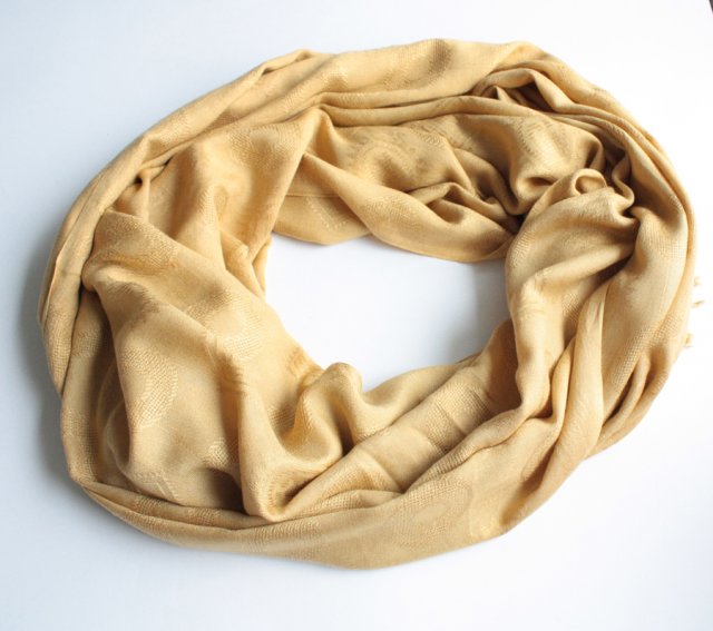 Duży, wytłaczany szal w subtelne wzory w tym samym odcieniu. Tkanina jest miła w dotyku. Jest to prawdopodobnie wiskoza.