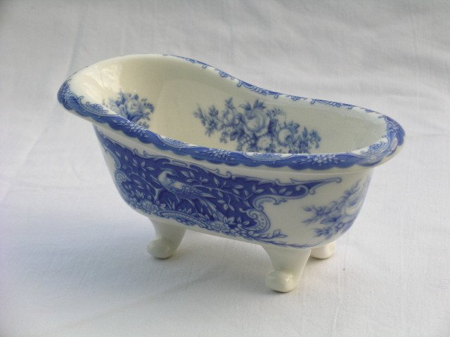 Elegancka, stylowa mydelniczka porcelanowa w kształcie ekskluzywnej wanny, bogato w niebieskościach kwiatowo-ptasim wzorem zdobiona, sygnowana Past Times. Piękny kształt starej wanny w miniaturze... no i te nóżki :) Wewnątrz bez dziurek, ale z mydelniczkowym, charakterystycznym ryflowaniem. Błyszczące wykończenie. 15,5 x 7,5 x 8 cm. Stan zachowania bardzo dobry. Niewątpliwa, oryginalna łazienki ozdoba.