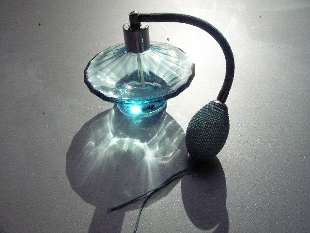 Wtworna to rzecz, Z grubego,ryflowanego błękitnego szkła wykonana buteleczka buduwrowo-łazienkowa. Na wodę toaletową,czt też inna perfumę :)