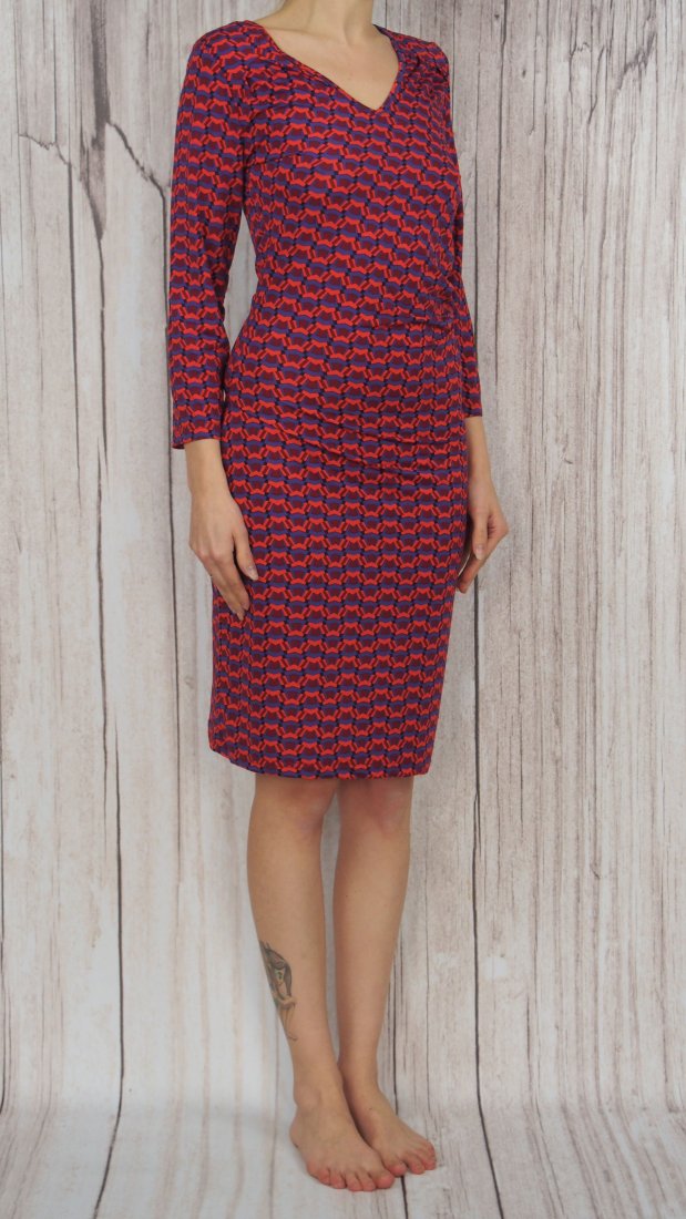 Śliczna sukienka we wzorki z poliestru z dodatkiem elastyny. Z boku marszczona.