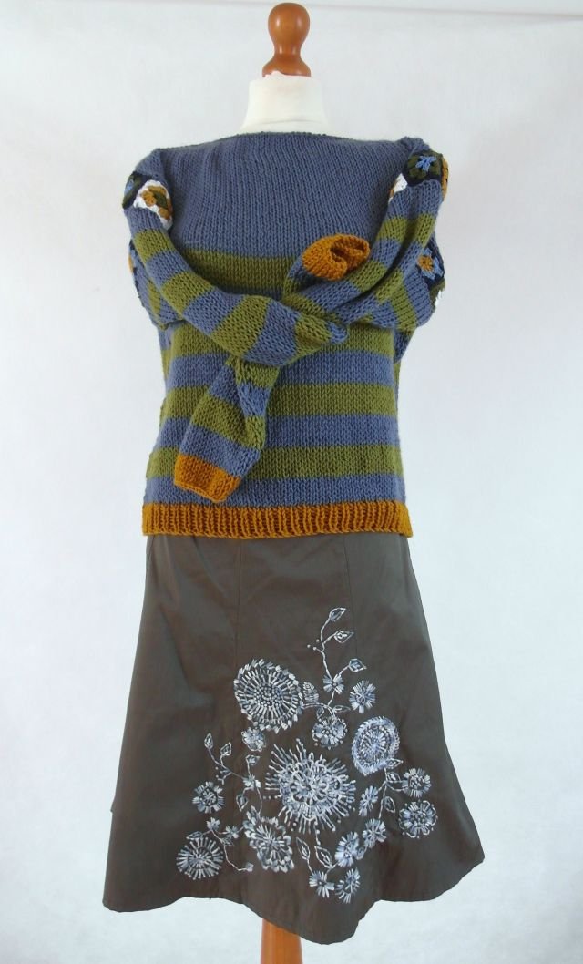 bardzo przyjemne kolory - stonowany niebieski (dżinsowy), oliwkowy i ugier. Cały pasiasty a przy ramionach ozdobiony kolorowymi kwadracikami granny square. Nie jest zbyt gruby ani ciężki.Fajny na cienkie golfy, koszule.