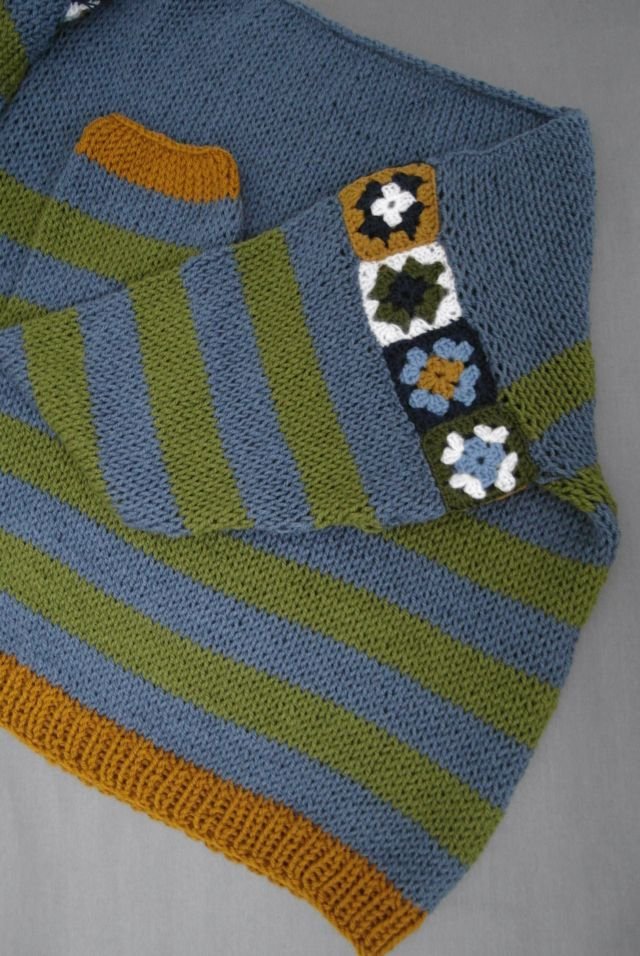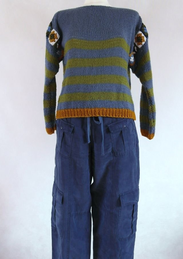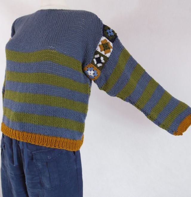 bardzo przyjemne kolory - stonowany niebieski (dżinsowy), oliwkowy i ugier. Cały pasiasty a przy ramionach ozdobiony kolorowymi kwadracikami granny square. Nie jest zbyt gruby ani ciężki.Fajny na cienkie golfy, koszule.