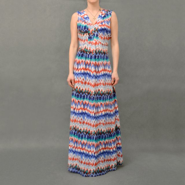 Długa, elastyczna sukienka. W kolorowy wzór. Wiązana z tyłu. Biust ładnie i delikatnie marszczony.