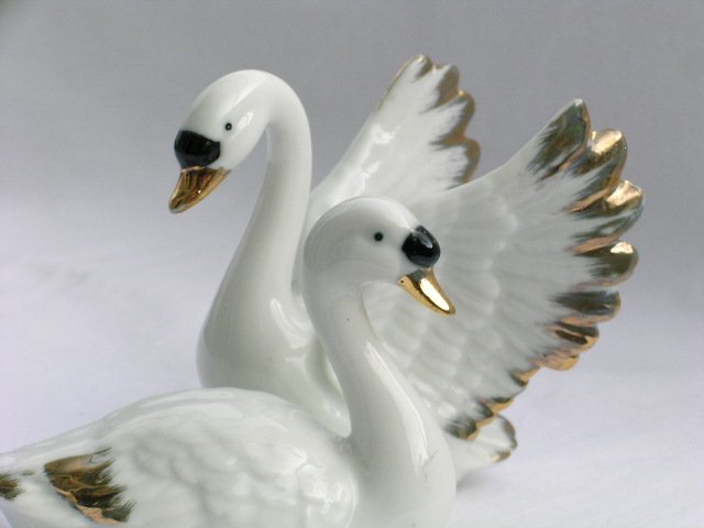 Porcelanowy duet - ona spokojna, on w zjawiskowym skrzydeł rozpostarciu :) Precyzja wykonania, ręczne złocenie i malowanie i nieodparty wdzięk. Puste w środku, lekkie, bardzo klasycznie dekoracyjne, np. do łazienki... 8 x 5,5 x 8 i 8,5 x 3 x 6 cm. Stan zachowania bardzo dobry.