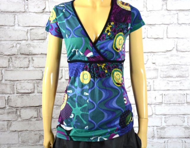 Kolorowa bluzka w printy w stylu marki Desigual o poszerzanym kroju, dekolt głębszy kopertowy, pod biustem odcięta plus dodatkowo wiązana, dół bluzki luźniejszy.
