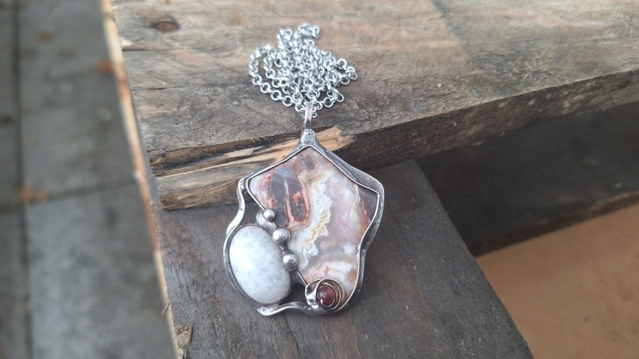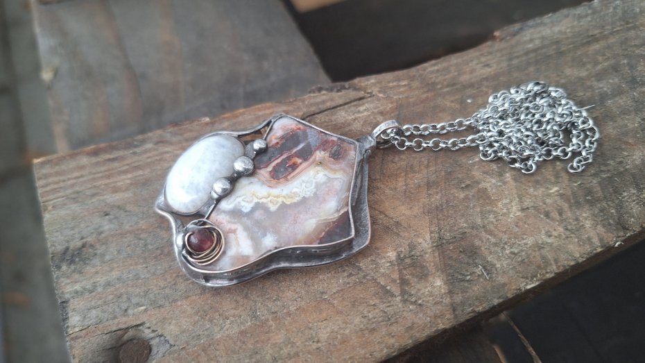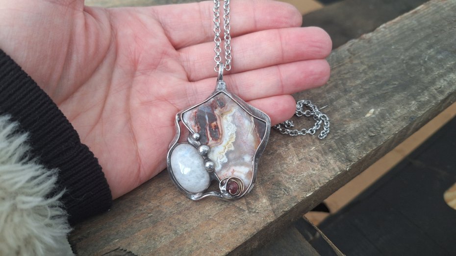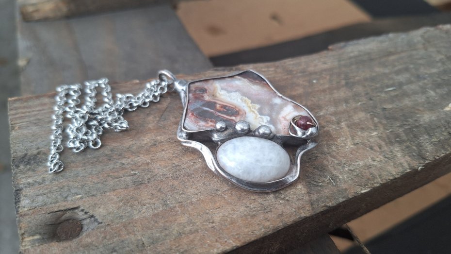 Wisiorek wykonany z miedzi, cyny, kamienia księżycowego, turmalinu i naturalnego agatu. Wymiary ok. 5 na 4 cm. Zawieszony na łańcuszku o długości ok. 50 cm.