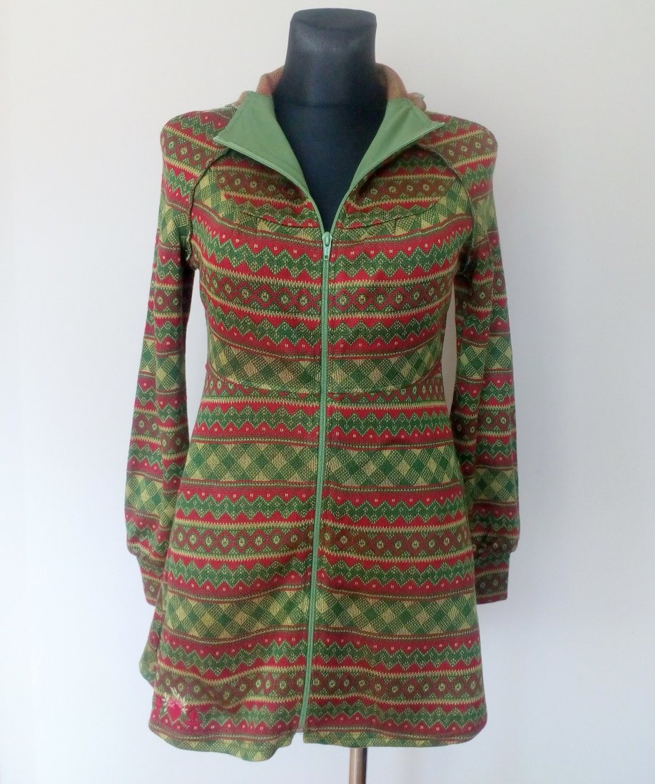 Dzianinowa bluza z kapturem, zapinana na zamek, rękawy raglanowe z mankietem, w szwach z przodu wpuszczane kieszenie, całość bez podszewki