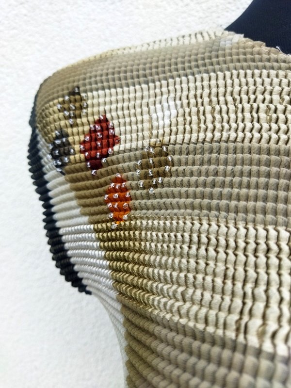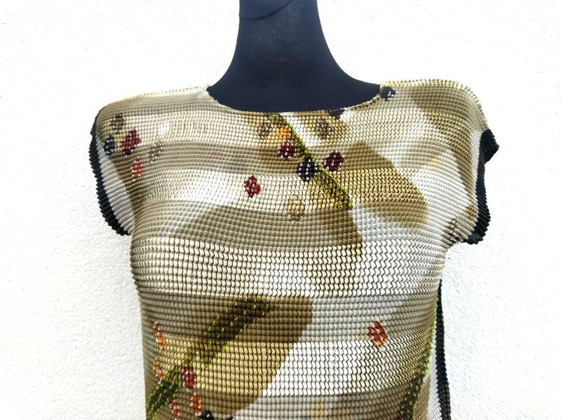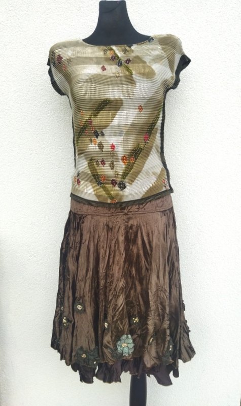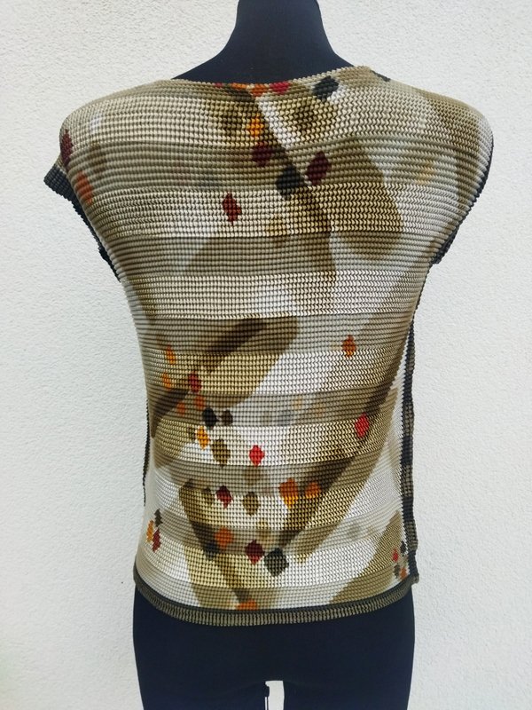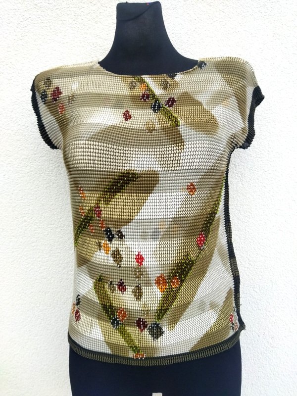 Poliestrowa rozciągliwa bluzka z popcornową fakturą w kolorze beżu, oliwki, żółci , kasztanowego brązu i czerwieni.