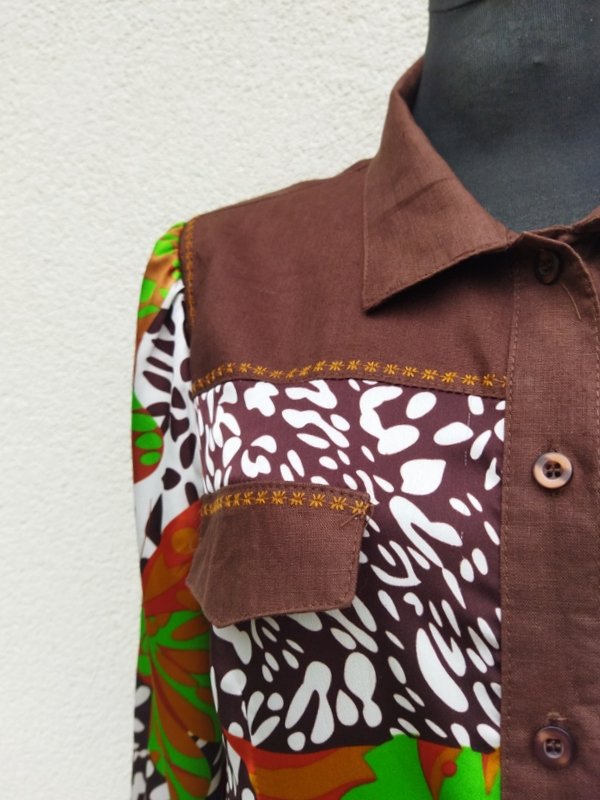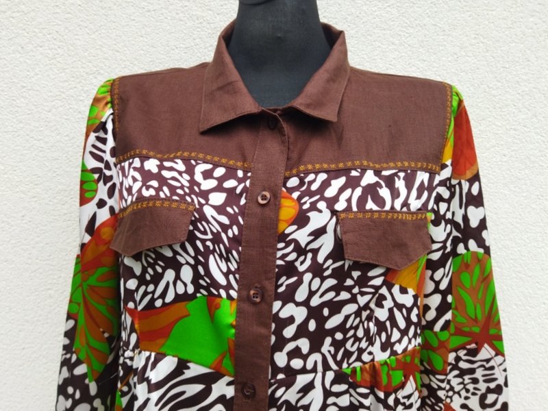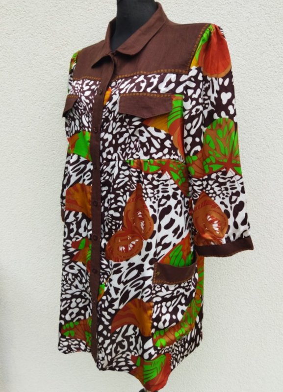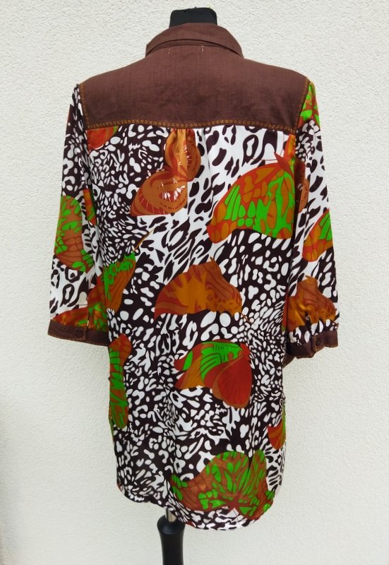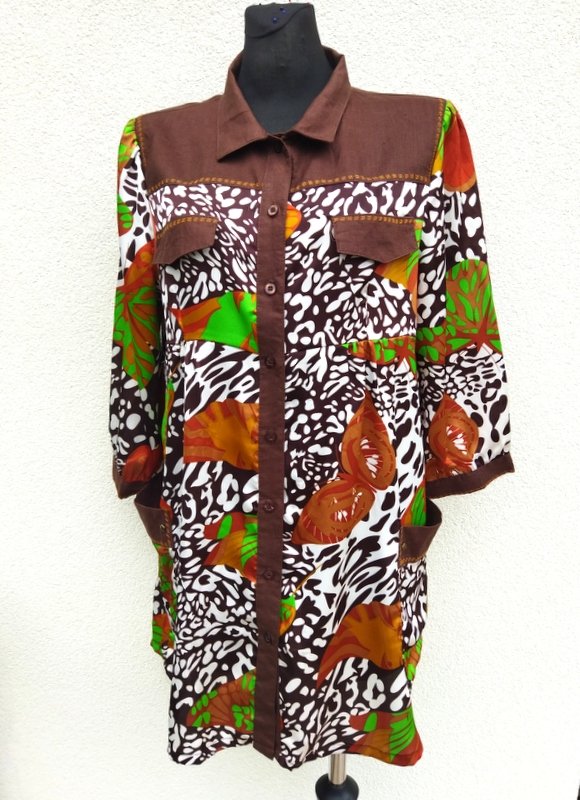 Dłuższa koszulowa bluzka lub tunika z miłej cienkiej tkaniny poliestrowej z motywem motyli w kolorach świeżej zieleni, ciemnego brązu, beżu, bieli i cynobru z elementami wykończeniowymi z nieco grubszej jednobarwnej tkaniny poliestrowej z fakturą lnu w kolorze gorzkiej czekolady zdobionymi dyskretnym haftem ( kołnierz, karczki mankiety rękawów i obszycia kieszeni: Z kołnierzem , z dwiema naszywanymi kieszeniami u dołu i imitacją dwóch kieszeni u góry. Zapinana na całej długości na małe guziczki