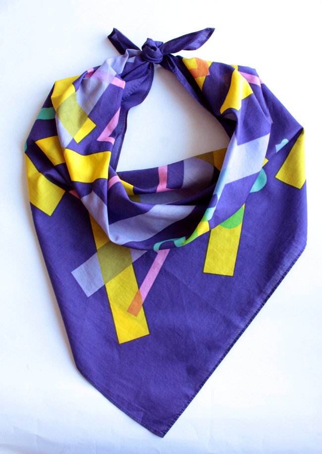 Miękka, duża chusta w różnych odcieniach fioletu. Chusta wykonana prawdopodobnie z bawełny lub wiskozy. Wzory w kolorach: żółtym, turkusowym, jasnoróżowym.