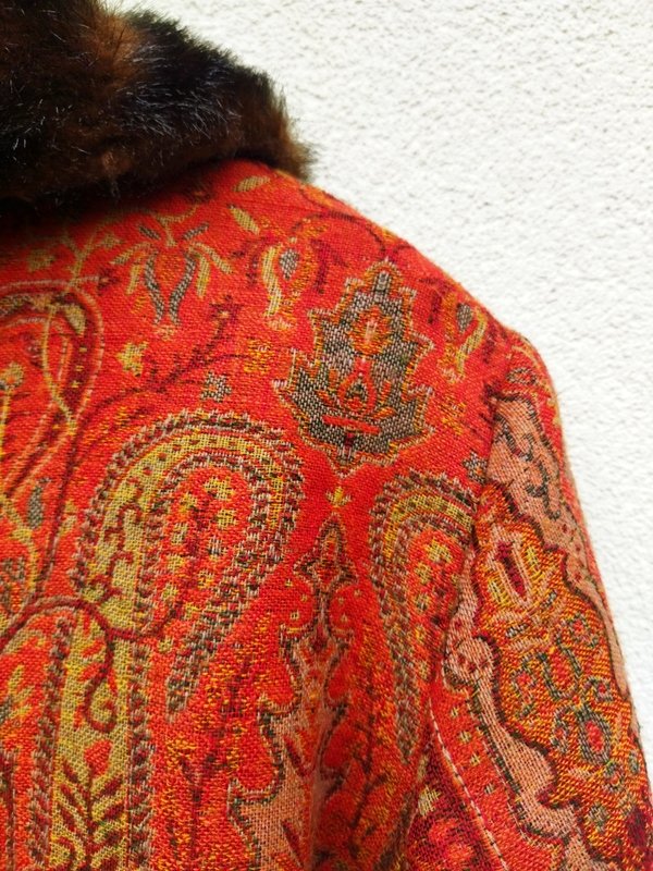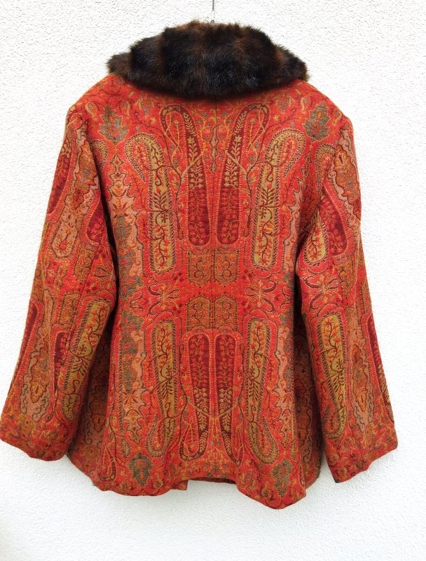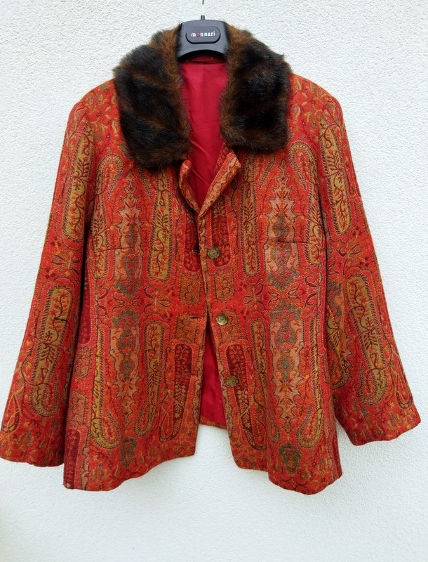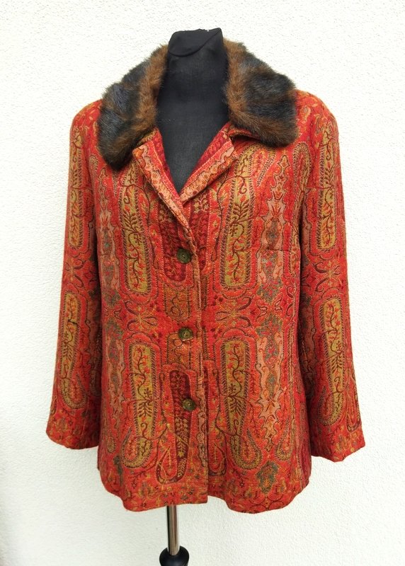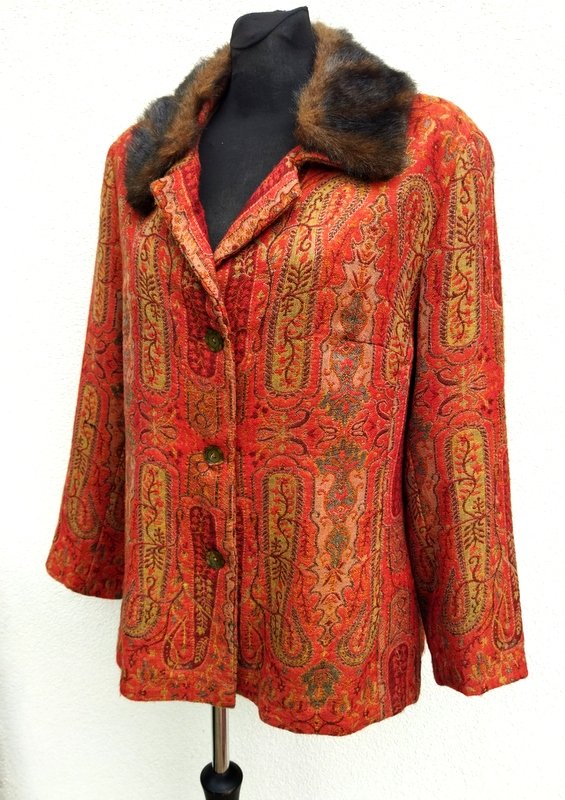 Piękna marynarka lub kurtka z dobrej jakości tkaniny w orientalne wzory w ciepłych kolorach z dominacją czerwieni w cynobrowym odcieniu. Z kołnierzem z doszywanym futerkiem. Zapinana na guziki . całość na podszewce.