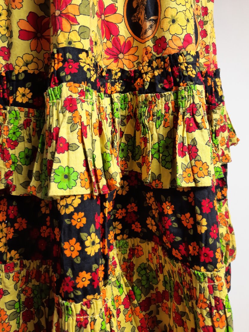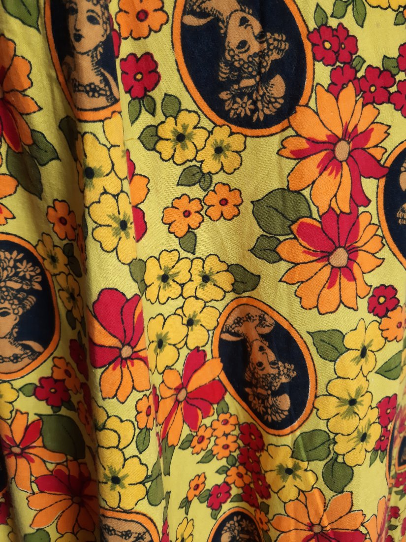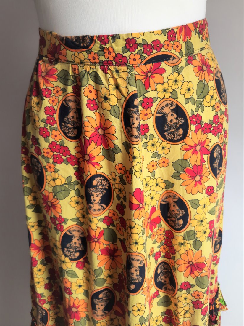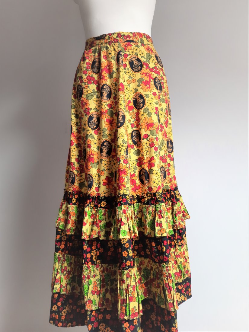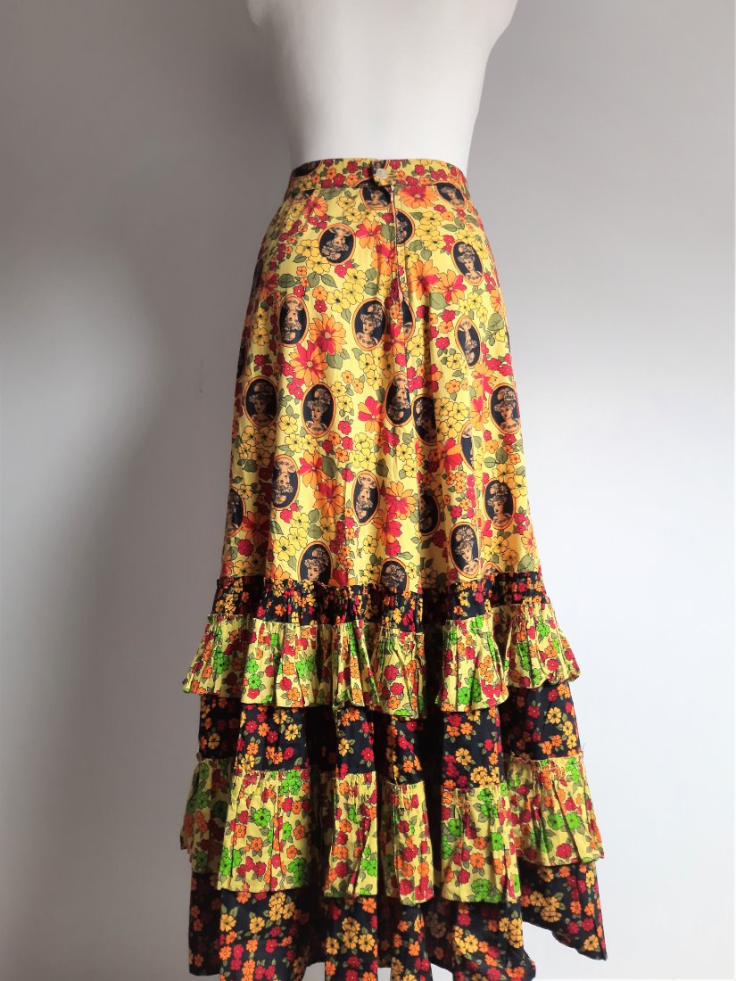 piękna długa bawełniana spódnica vintage z lat 70-tych, w kolorowe kwiaty oraz portret damy w kapeluszu, dół patchworkowy i z falbankami, z wyższym stanem, z tyłu zapinana na guzik i suwak, bez podszewki, nieco cięższa z powodu falban