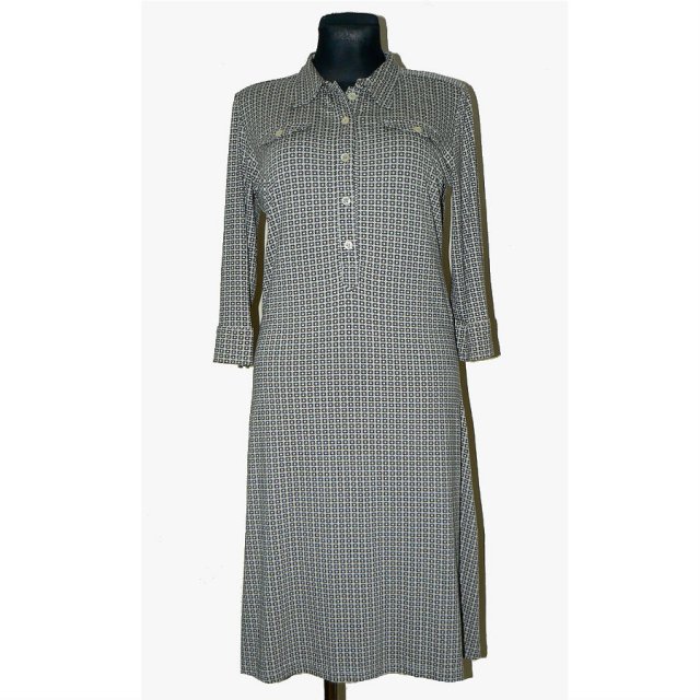 Sukienka w drobny wzorek w odcieniach jasno i ciemno szarych. Na piersiach atrapy kieszonek, od połowy zapinana na guziki. Rękaw 3/4.