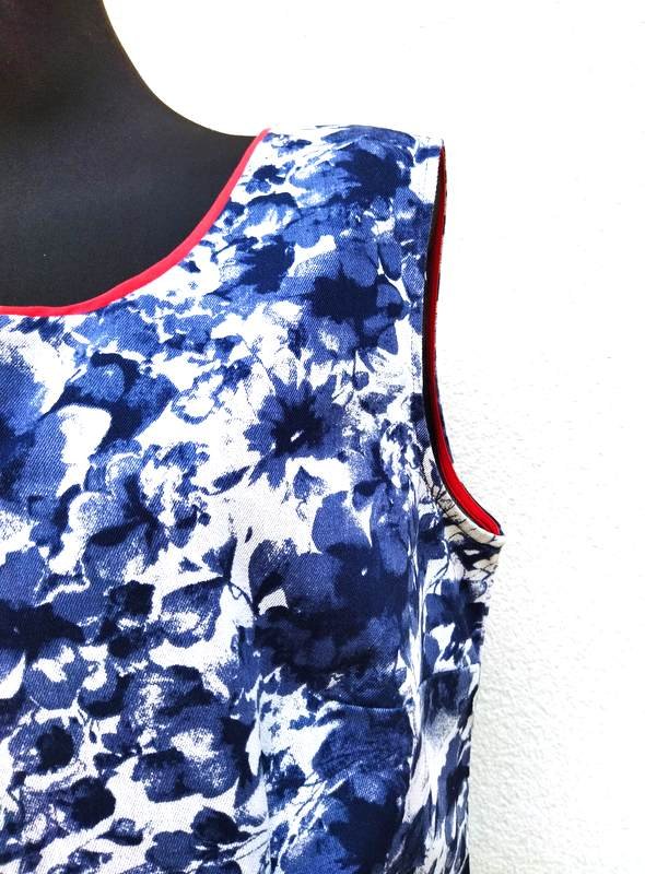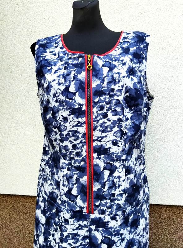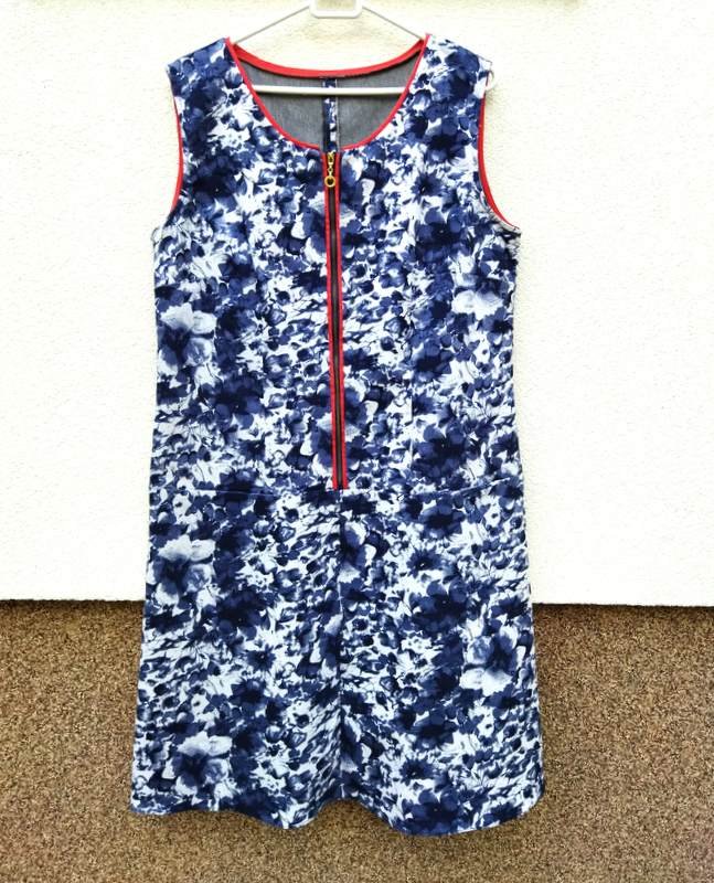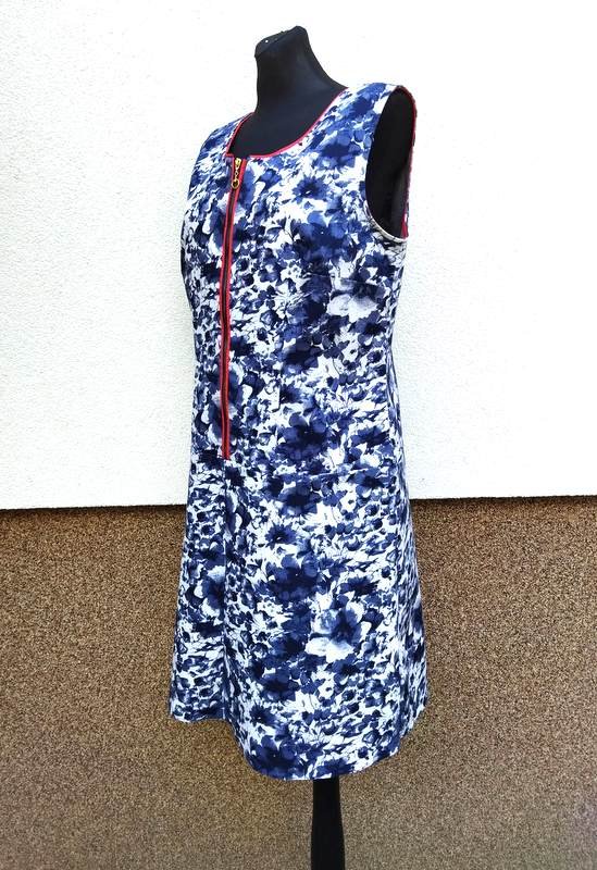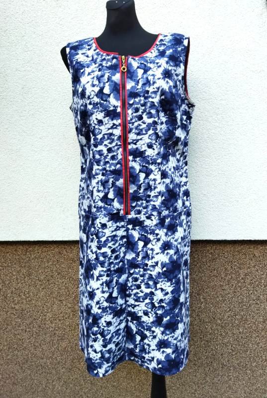 Sukienka z grubszej a' la jeansowej tkaniny bawełnianej w granatowo- szaro -czarne kwiatowe wzory na białym tle, ożywiona czerwonymi lamówkami.