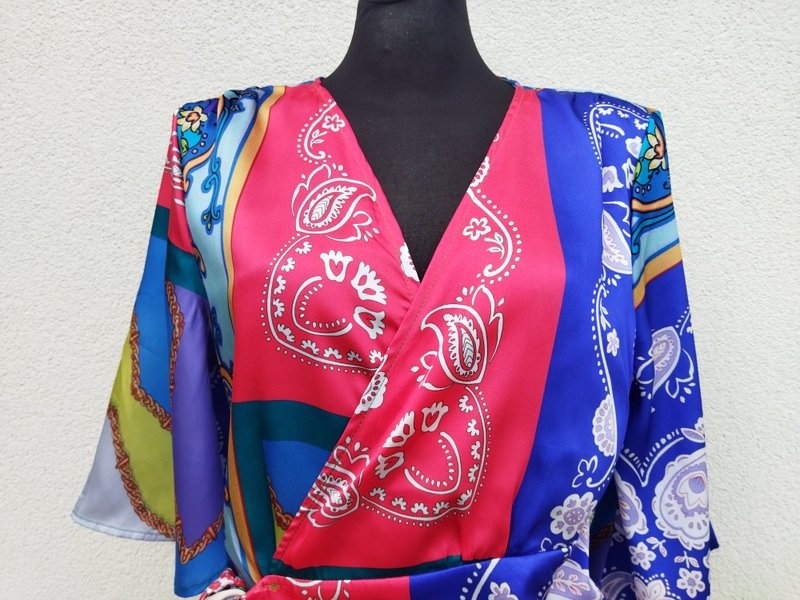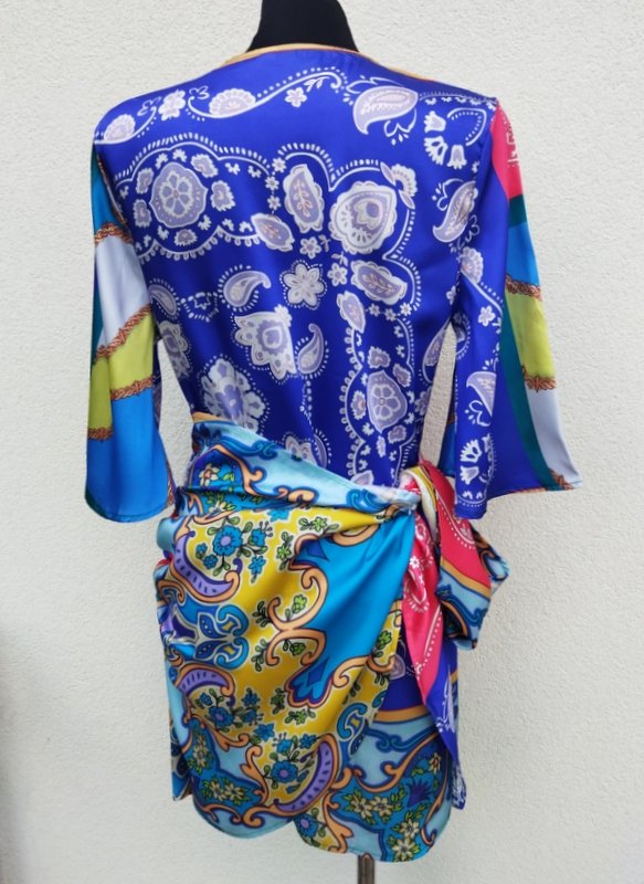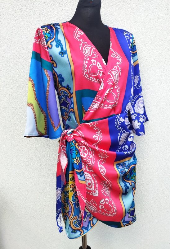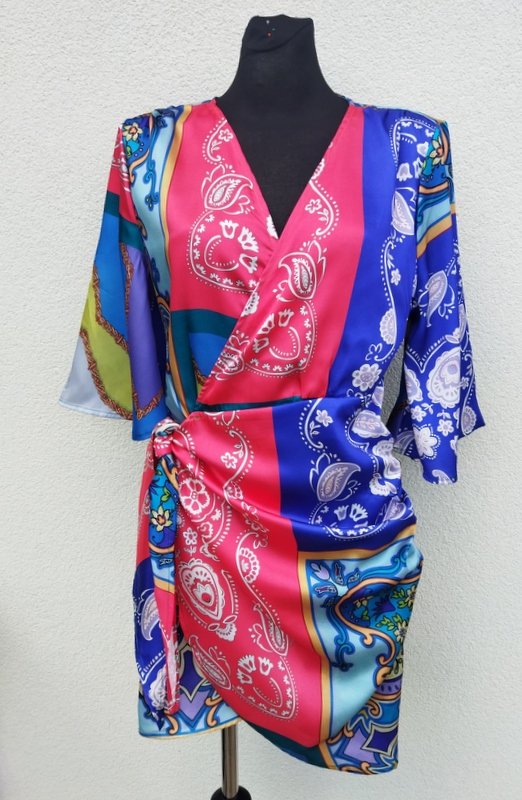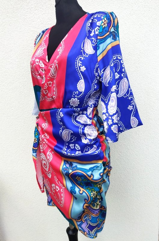 Świetna sukienka z miłej wzorzystej tkaniny poliestrowej z jedwabistym połyskiem , w żywych barwach. Zakładana kopertowo, z jednego boku zapinana od wewnątrz na trzy małe guziczki z tego samego boku doszywana w pasie drapowana nakładka wiązana z drugiego boku na szarfy, dekoly w szpic., lekko dzwonkowate rękawy