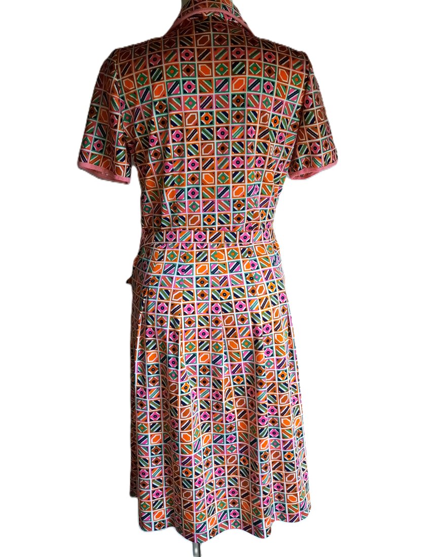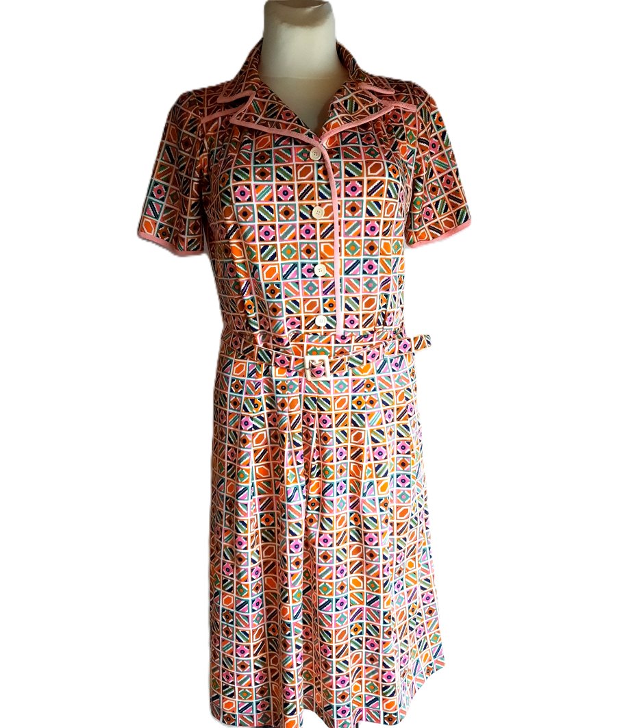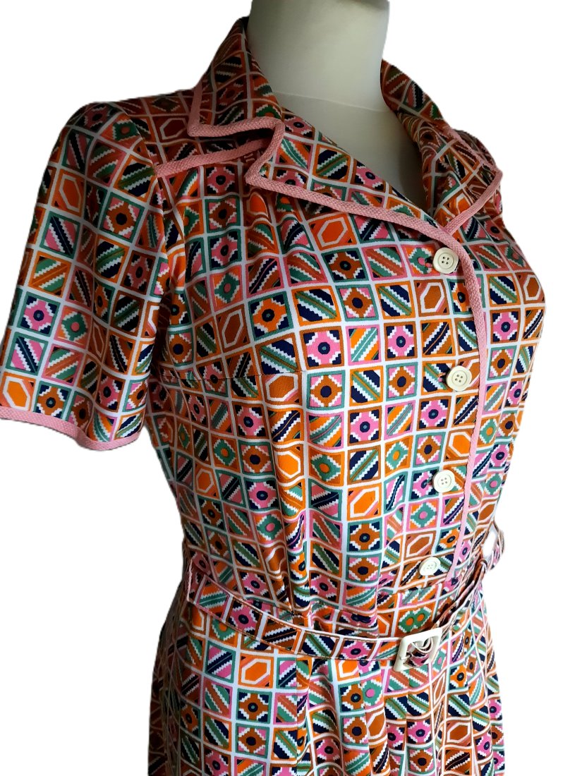 urocza kolorowa koszulowa sukienka vintage według mnie z lat 70-tych, abstrakcyjne wzory, zapinana do połowy na guziki, z kołnierzykiem, krótki rękawek, dekolt, kołnierzyk i rękawki obszyte różową lamówką, sukienka w pasie odcinana, z paskiem, dół z zakładkami, z boku zapinana na suwak, bez podszewki, długość za kolano, brak metki z rozmiarem i składem