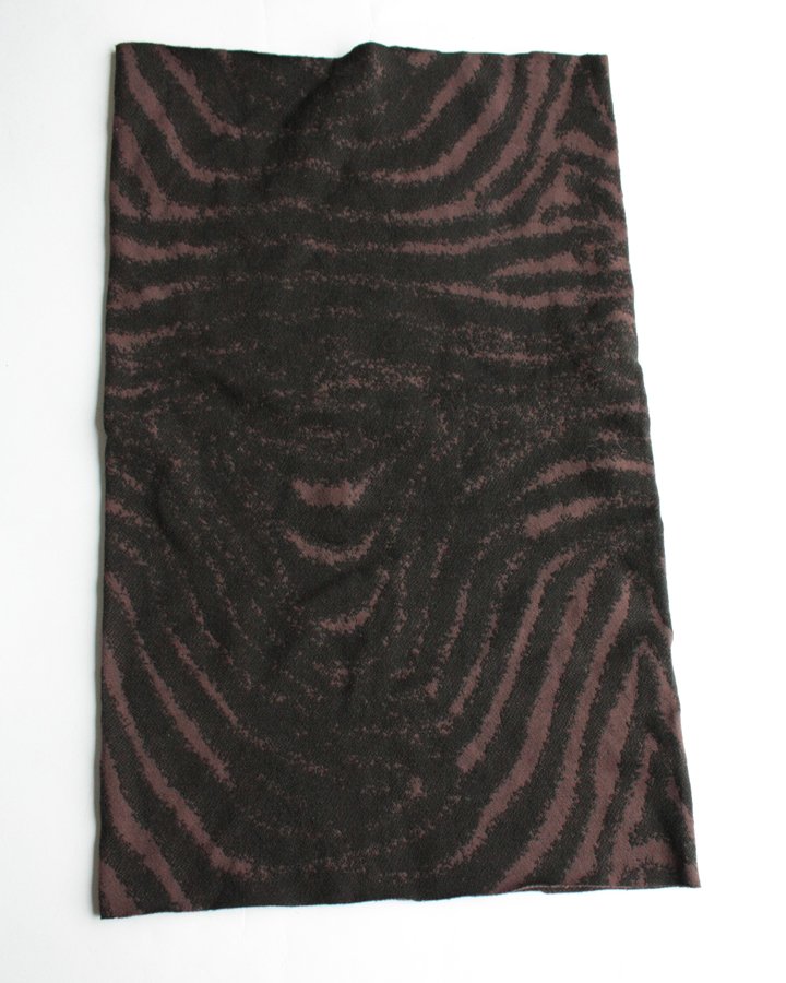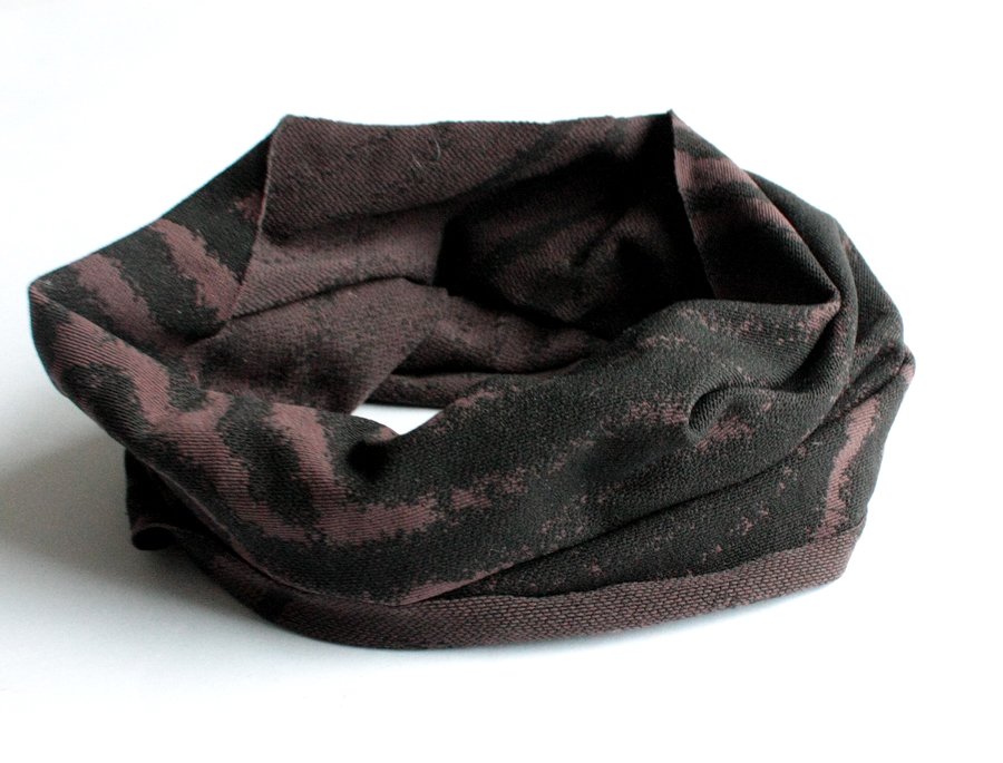 Komin w odcieniach brązu i czerni wykonany ze sprężystej tkaniny.