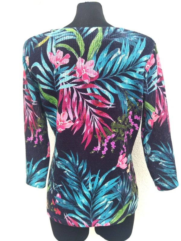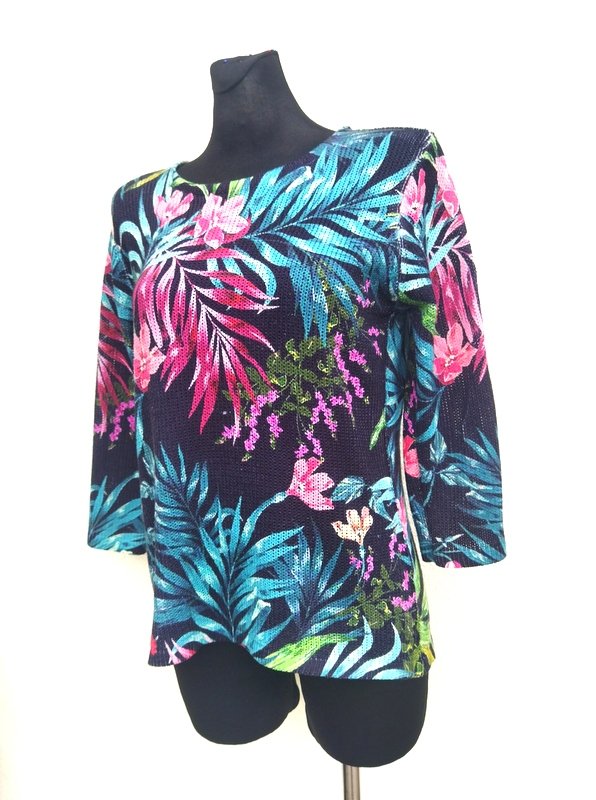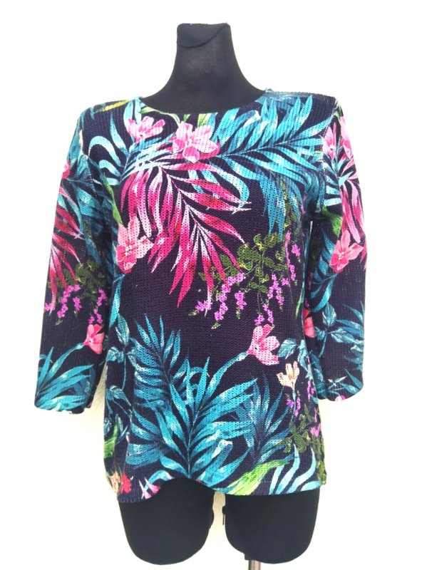 Wzorzysty sweter w tropikalne wzory roślinne w żywych barwach. Owalny dekolt , rekawy 3/4