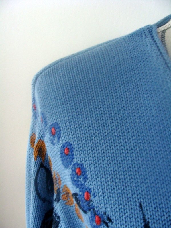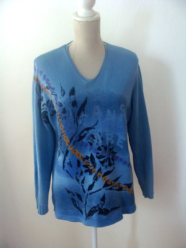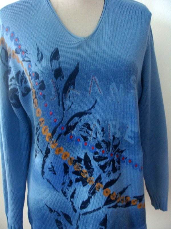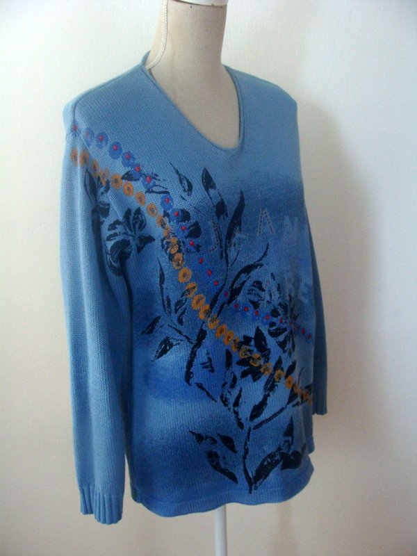 Bawełniano- akrylowy sweter w błękitnym kolorze z cieniowanym przodem i kwiatowym nadrukiem w kolorach zgaszonej żółci, czerwieni i czerni.