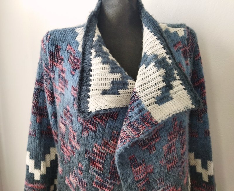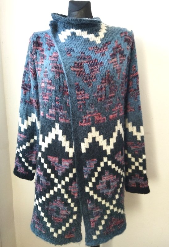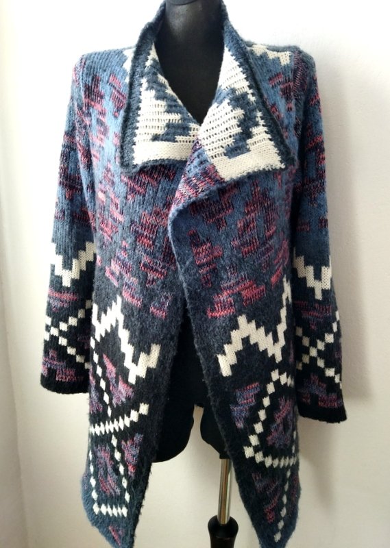 Miły, puszysty dłuższy wzorzysty sweter w przyjemnej kolorystyce. Fason otwarty - bez zapięcia.