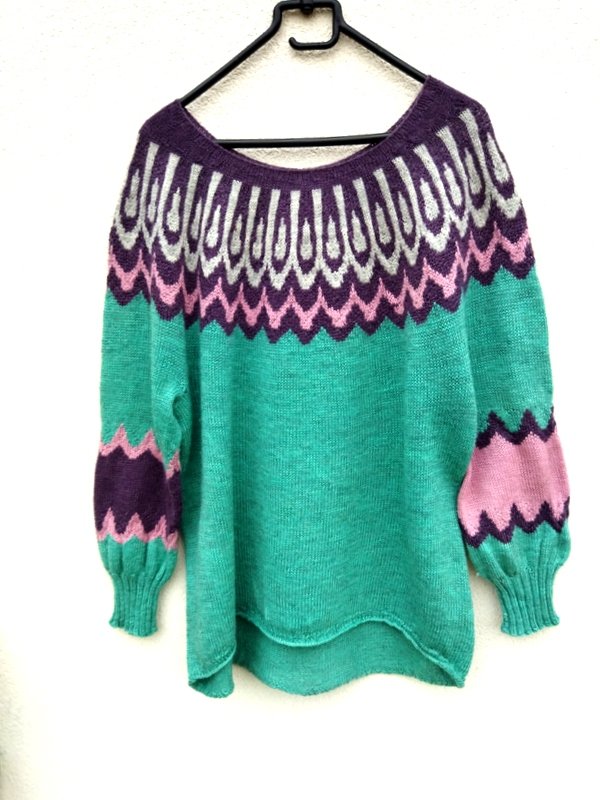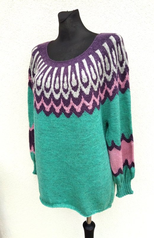 Piękny wzorzysty sweter w turkusowym kolorze z wzorami w kolorach zgaszonego fioletu, gołębiej szarości i zgaszonego różu z lekko wrzosowym odcieniem. Dziergany misternie na drutach, bezszwowy z okrągłym karczkiem. Asymetryczny - dłuższy z tyłu