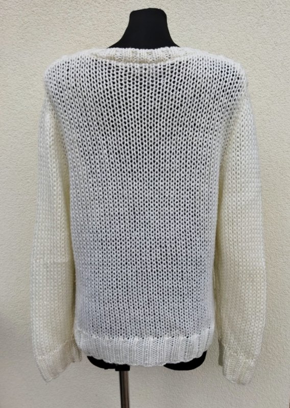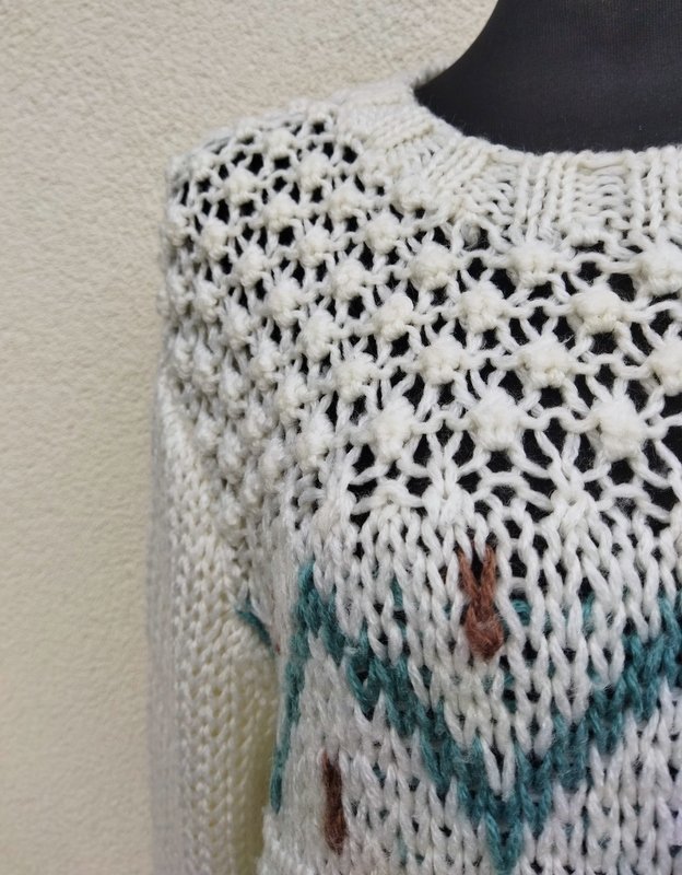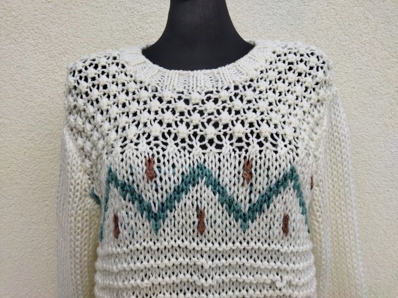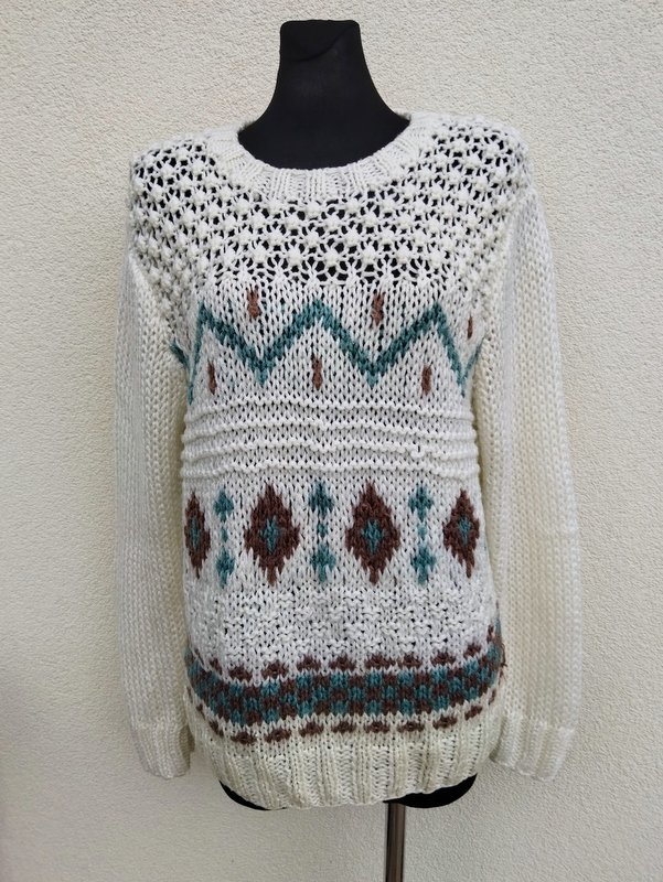 Sweter z mięsistej włóczki o luźnym splocie w kolorze mlecznej bieli z wzorami w miętowym i brązowym kolorze i ażurowym wzorem u góry. Wykończony ściagaczami.