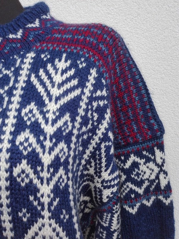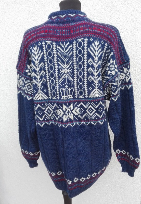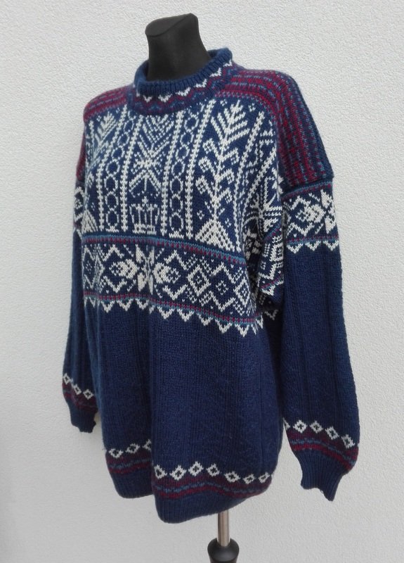 Ciepły sweter w granatowym kolorze w norweskie wzory w kolorystyce bieli, zgaszonej czerwieni i szafiru. Wykończony ściągaczami