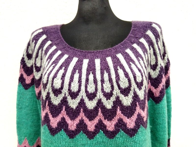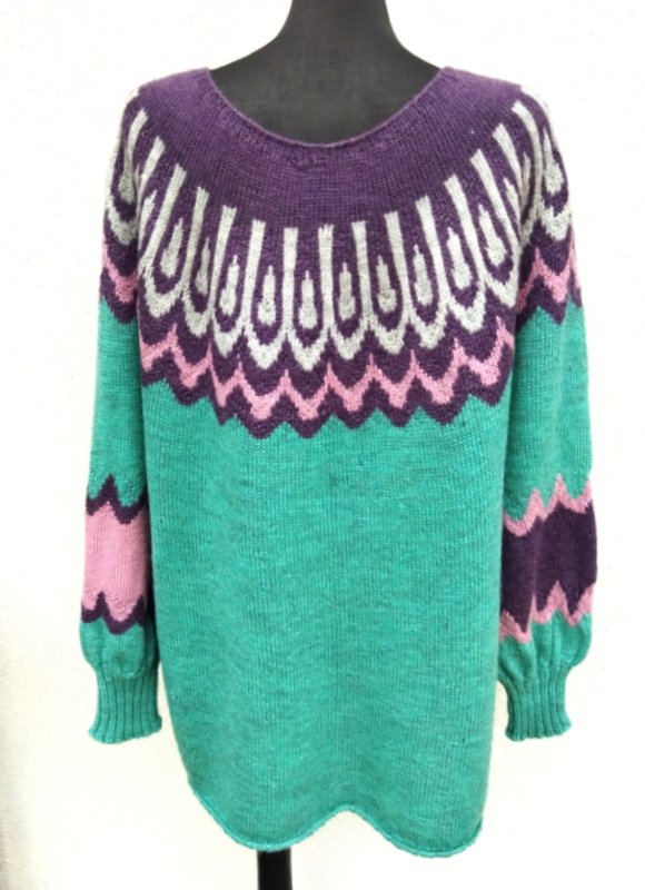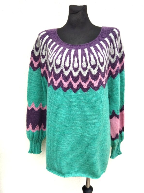 Piękny wzorzysty sweter w turkusowym kolorze z wzorami w kolorach zgaszonego fioletu, gołębiej szarości i zgaszonego różu z lekko wrzosowym odcieniem. Dziergany misternie na drutach, bezszwowy z okrągłym karczkiem. Asymetryczny - dłuższy z tyłu