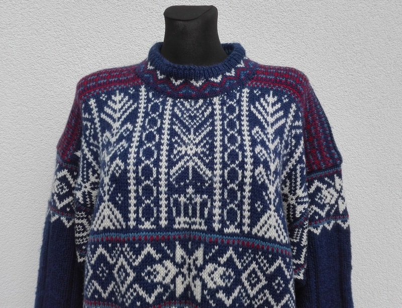 Ciepły sweter w granatowym kolorze w norweskie wzory w kolorystyce bieli, zgaszonej czerwieni i szafiru. Wykończony ściągaczami