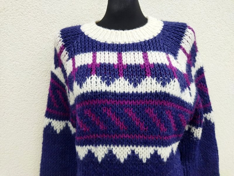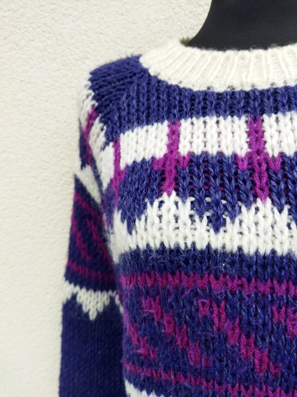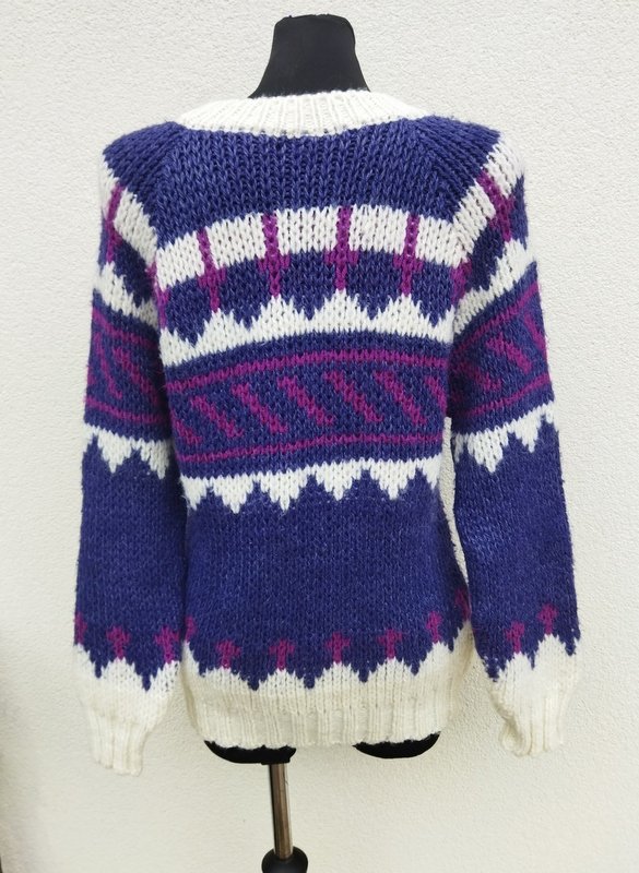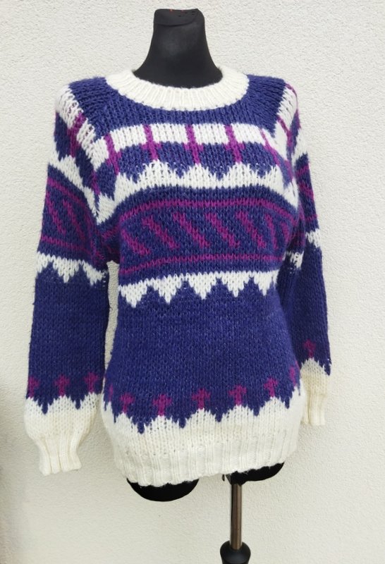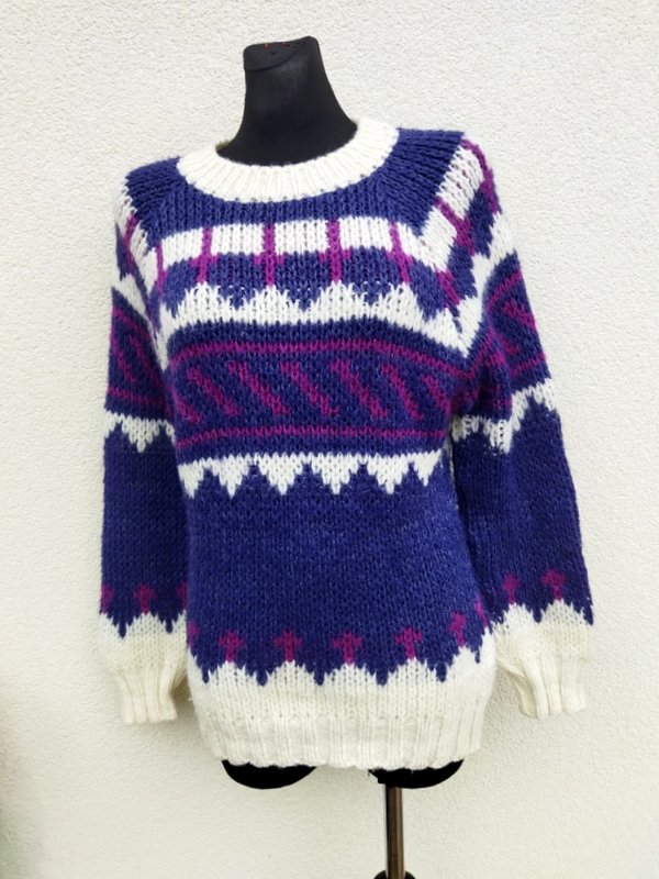 Wzorzysty sweter z mięsistej najprawdopodobniej akrylowej włóczki w kolorach bieli ,fioletu i atramentowego z kroplą fioletu. Owalny dekolt, rękawy raglanowe