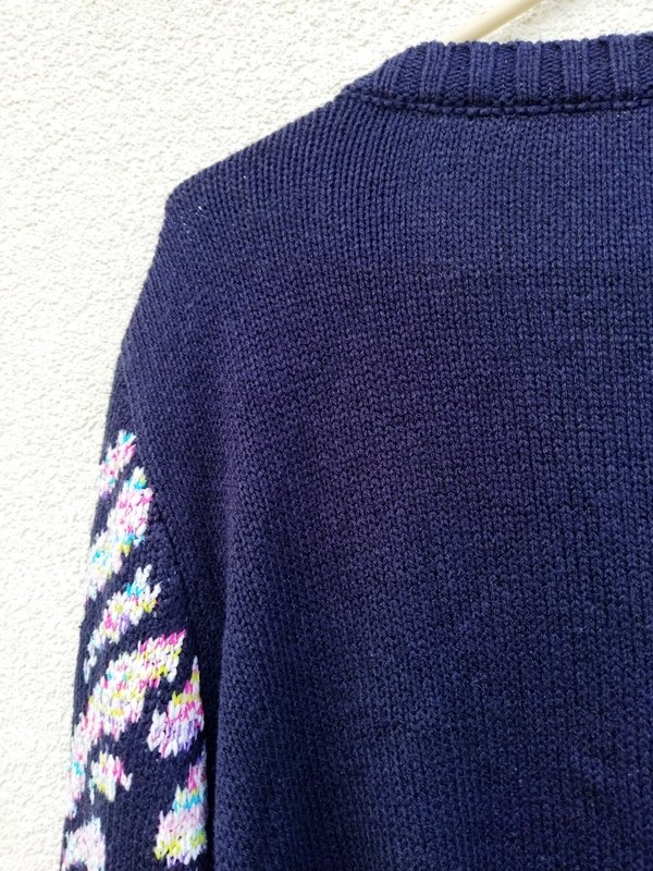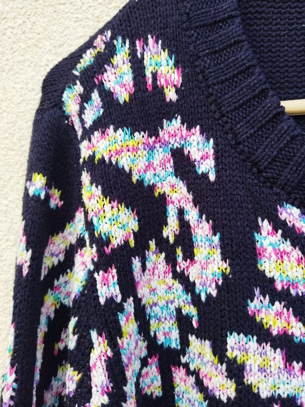 Ciekawy sweter w czarnym kolorze z motywem trąby słonia z kolorowej włóczki w pastelowej niebiesko- żółto - biało - różowej kolorystyce. Wykończony ściągaczami