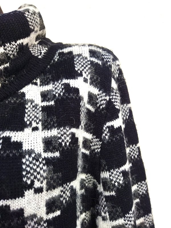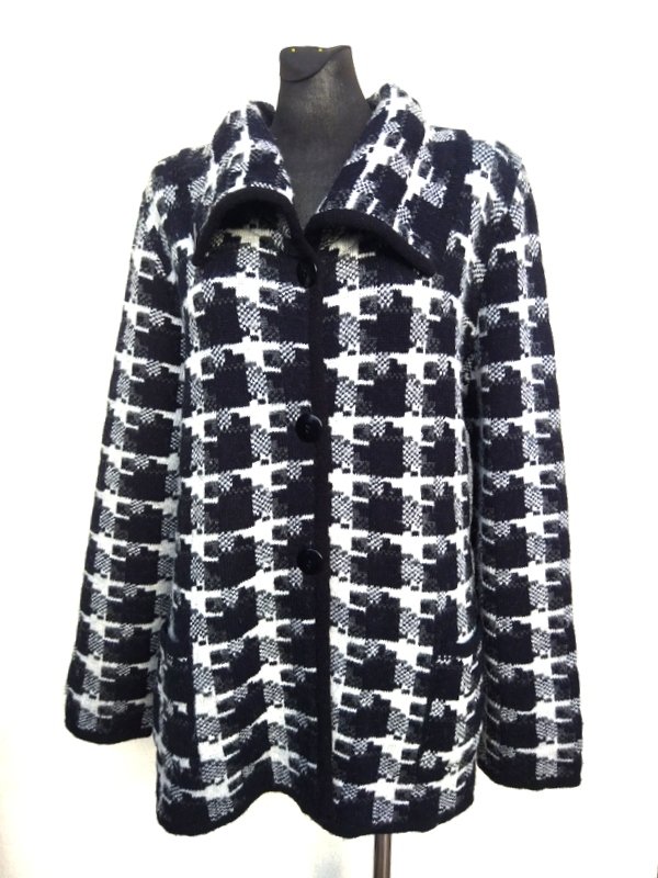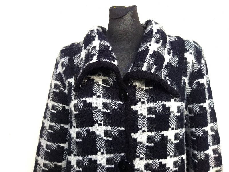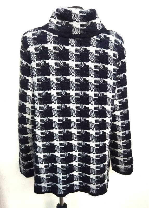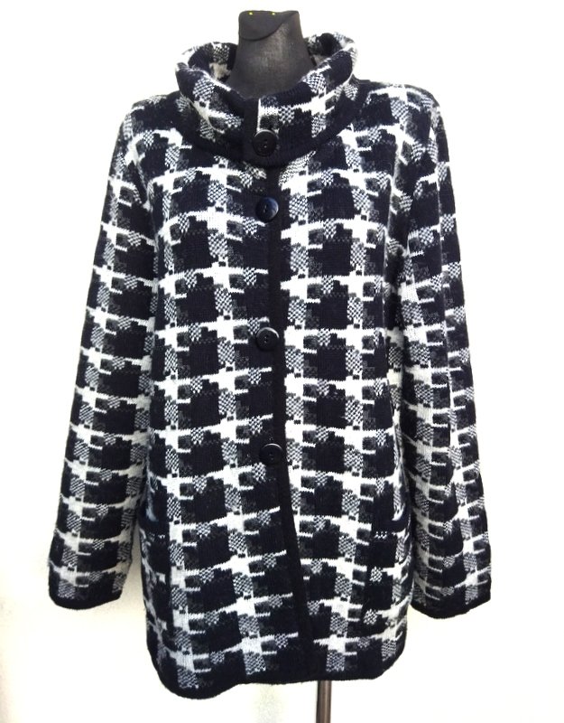 Ciepły mięsisty żakardowy sweter w kolorystyce czerni, bieli i szarości. Z wykładanym kołnierzem który można zapiąć wysoko pod szyją. Zapinany na całej długości na guziki. Może służyć jako odzienie wierzchnie.