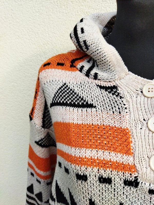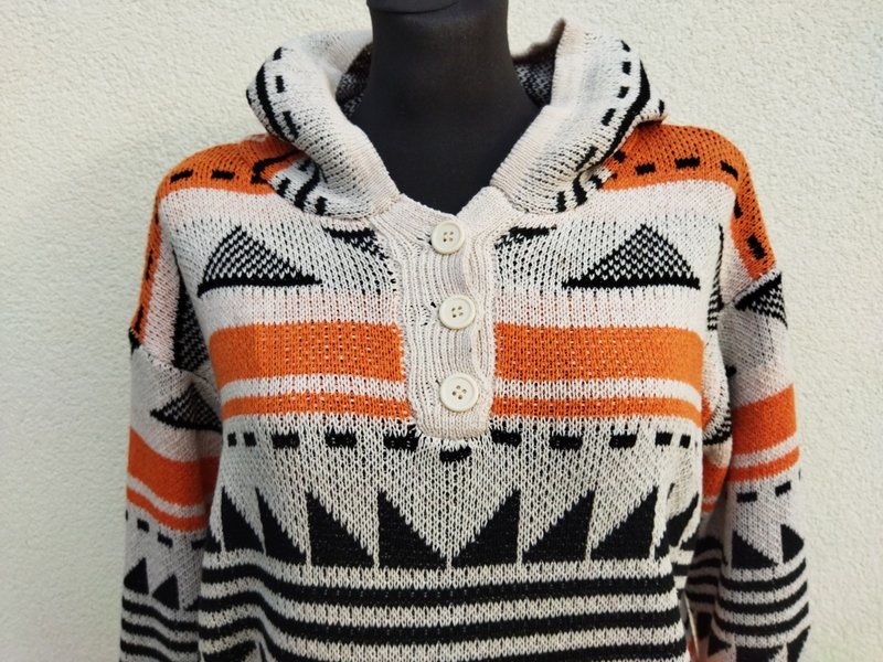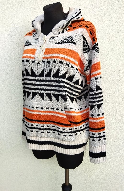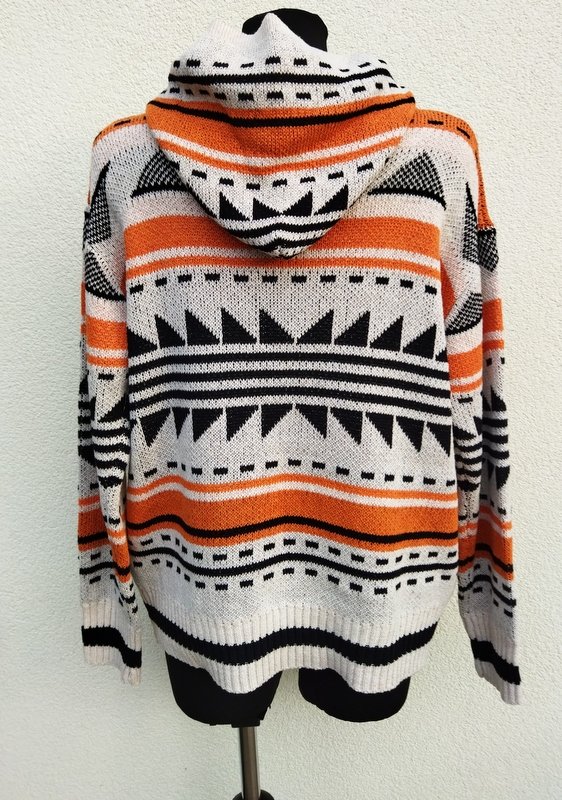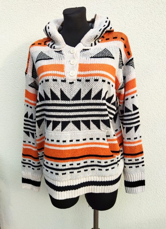 Wzorzysty, żakardowy sweter z akrylowej włóczki w geometryczne wzory w marchewkowo- czarnej kolorystyce na tle złamanej bieli. Z kapturem , z zapięciem typu polo i kangurkową kieszenią u dołu. Wykończony ściagaczami.