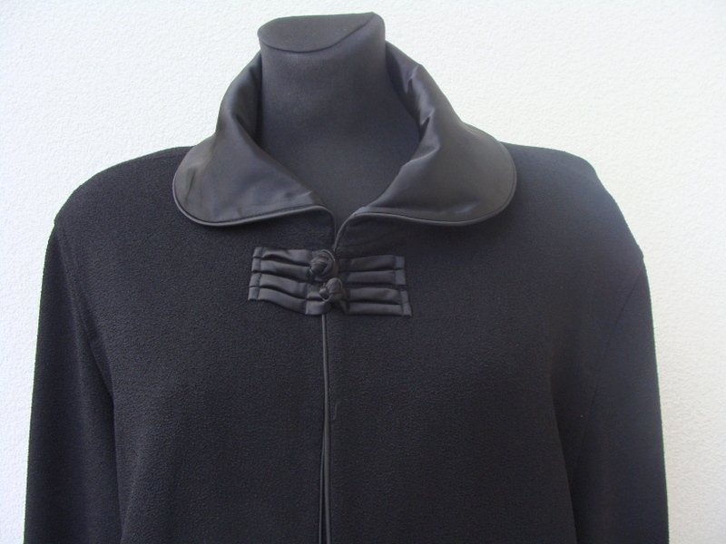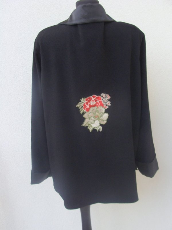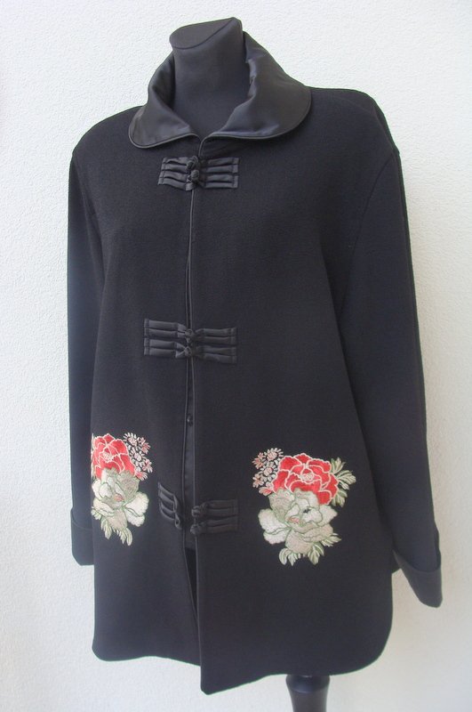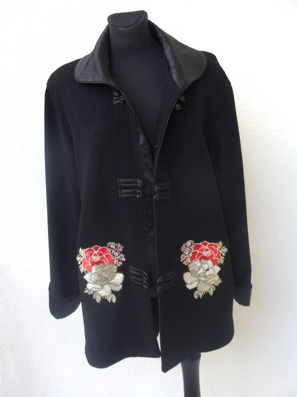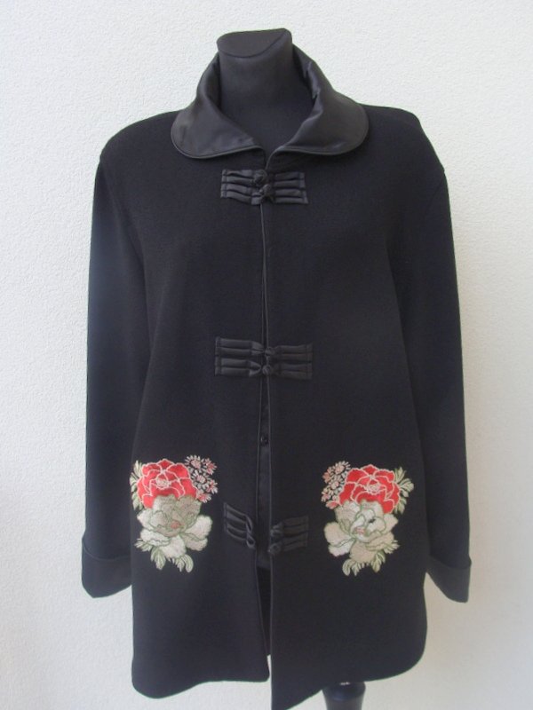 Piękna orientalna kurtka lub krótki płaszczyk z czarnej tkaniny o chropowatej fakturze zdobiona haftowanymi kwiatowymi aplikacjami, wykończenia: kołnierz , zapięcie , obszycia i mankiety rękawów z czarnej gładkiej tkaniny z lekko jedwabistym połyskiem. Prosty luźny fason, piękne szamerunkowe zapięcie, zaokrąglone rozcięcia po bokach. Całość na podszewce.
