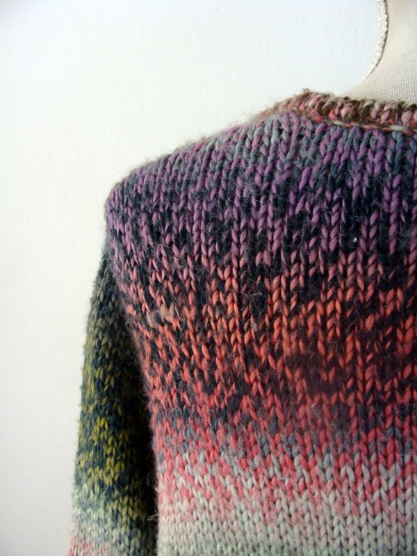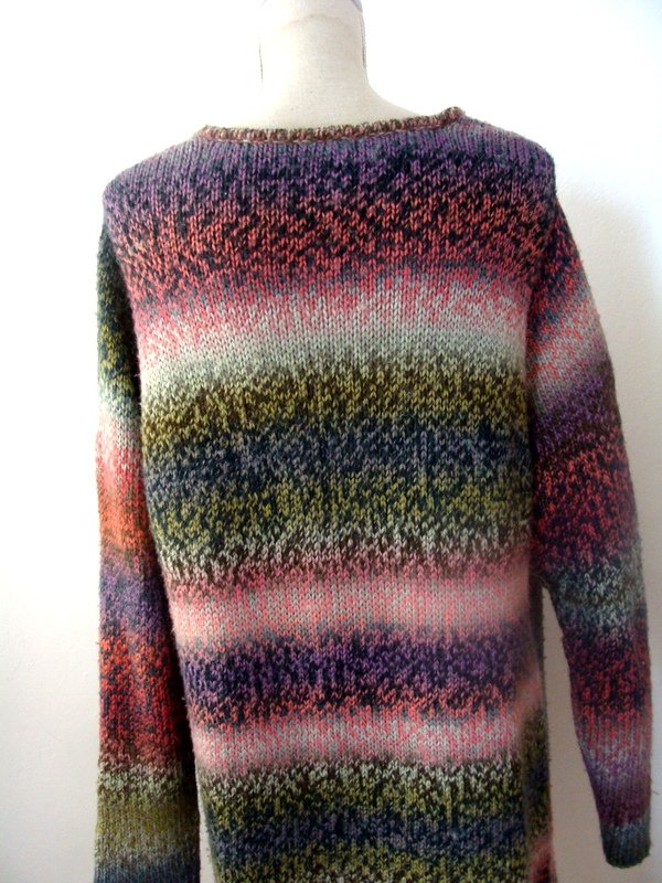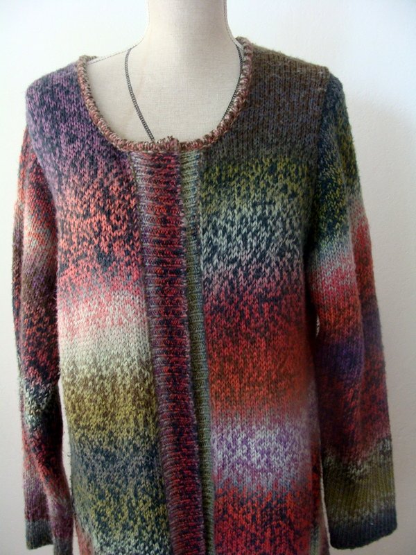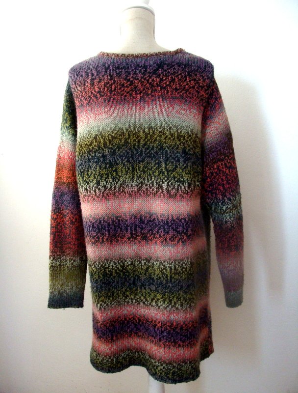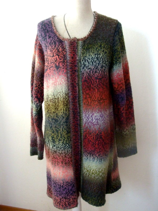 Wzorzysty sweter w przenikających się wzajemnie kolorach odcieni zieleni, czerwieni i różu, fioletu, błękitu i szarości. Fason otwarty bez zapiecia.