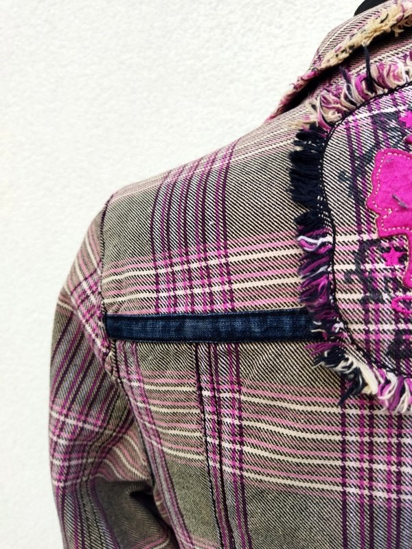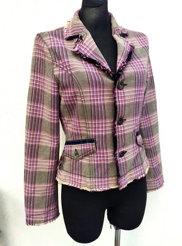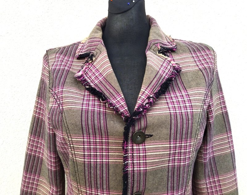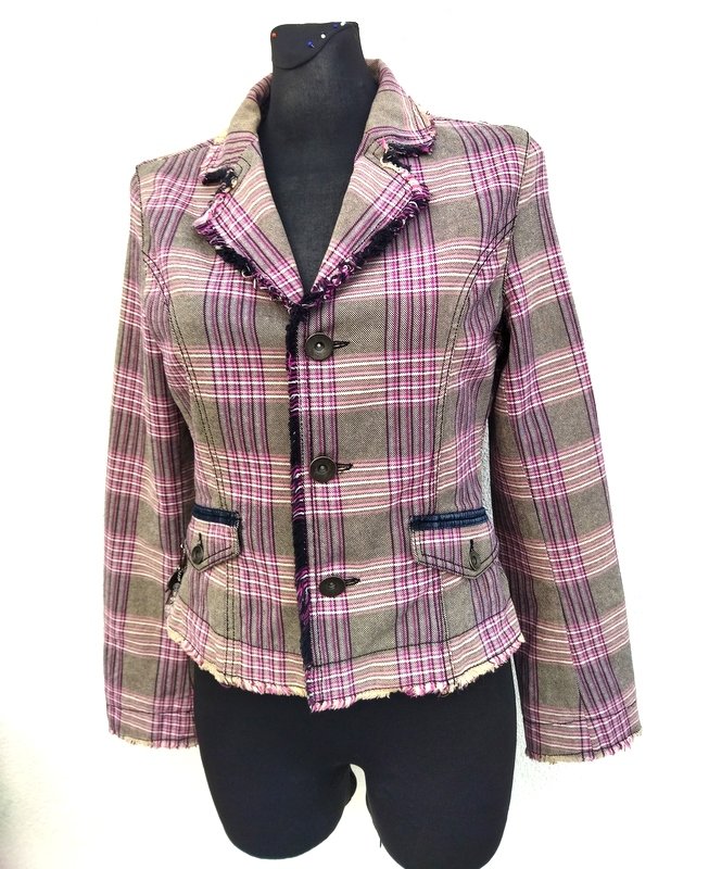 Zgrabna marynarka z bawełnianej tkaniny w kratkę w beżowo-czarno -bordowo-jasnoróżowej kolorystyce , wykończona frędzelkami wyciąganymi z tkaniny, Starannie uszyta z licznymi detalami. Taliowana , z kołnierzem z rewersami z dwiema wpuszczanymi kieszeniami z patkami z guzikiem i