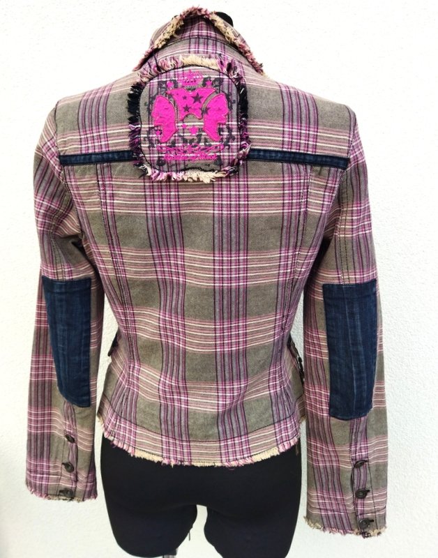czarną jeansową lamówką, na jednej kieszeni ozdobna przywieszka, z tyłu karczek z naszywaną aplikacją i czarną lamówka , na łokciach naszywane czarne jeansowe łatki. Zapinana na trzy metalowe napowe guziki , na trzy mniejsze zapinane mankiety rękawów. Całość na bawełnianej podszewce.