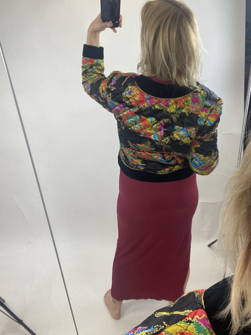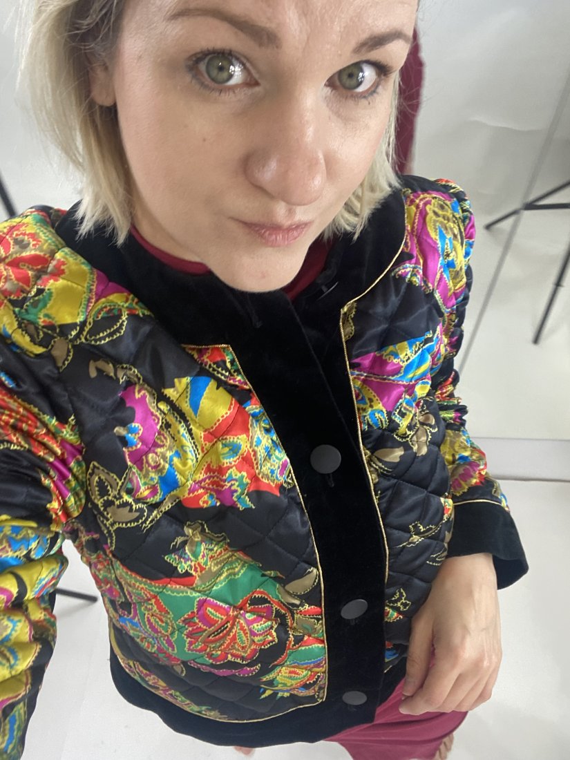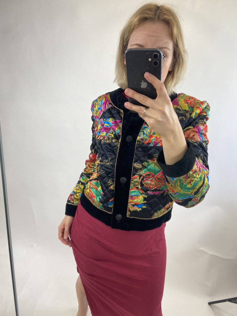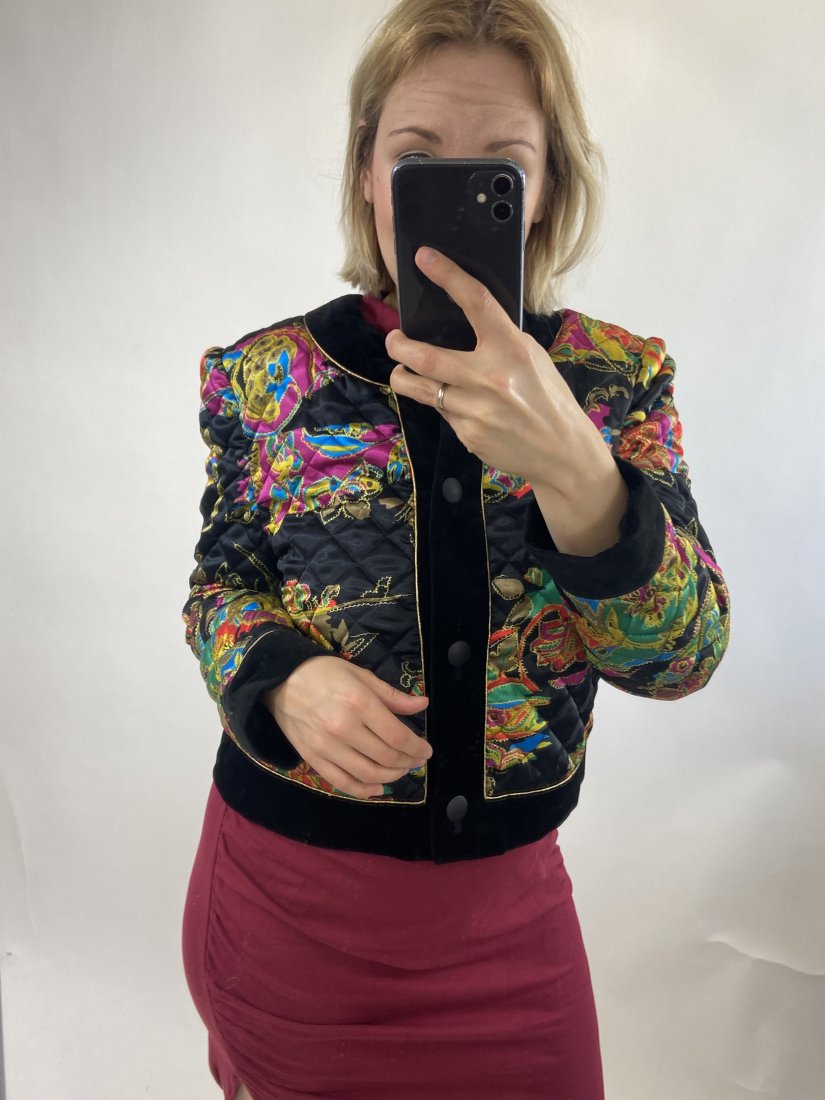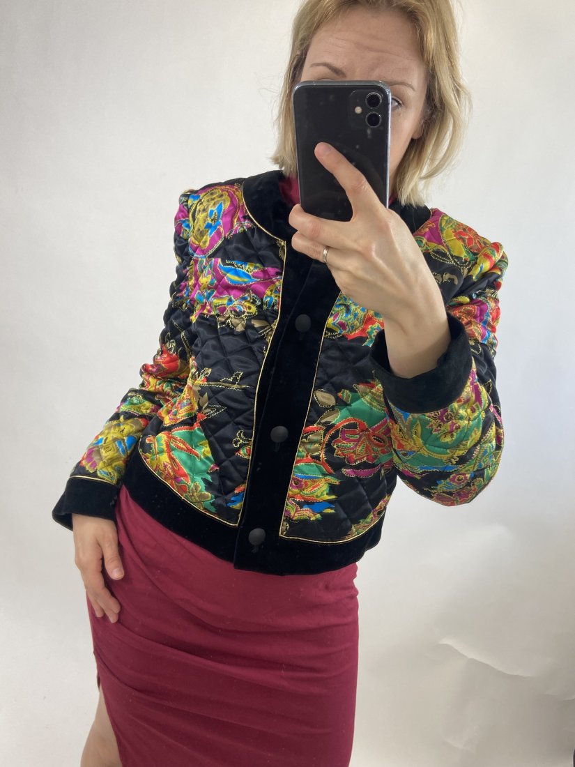 Pikowana kurteczka vintage. Lata 80te. Marka niemiecka Yarell, made in Western Germany. Materiał wierzch 100% satynowy poliester, obszycia 100% bawełna (welur), podszewka 100% wiskoza, wypełnienie poliester.