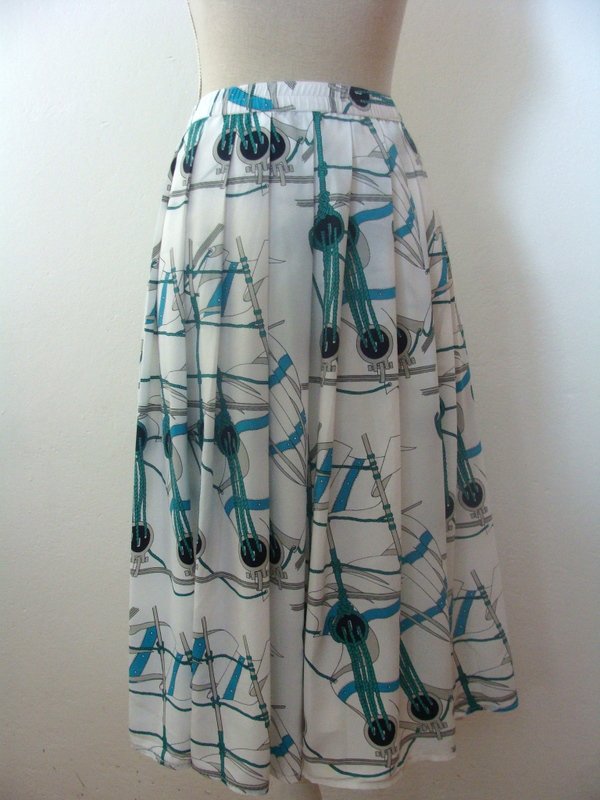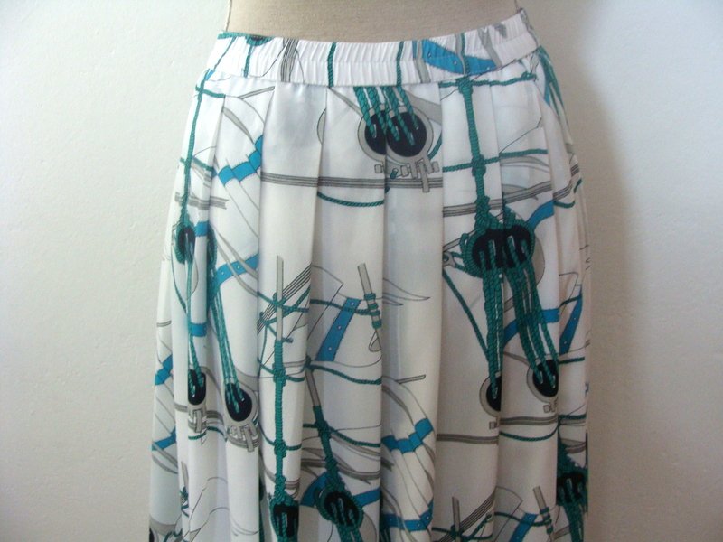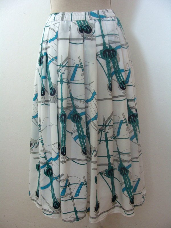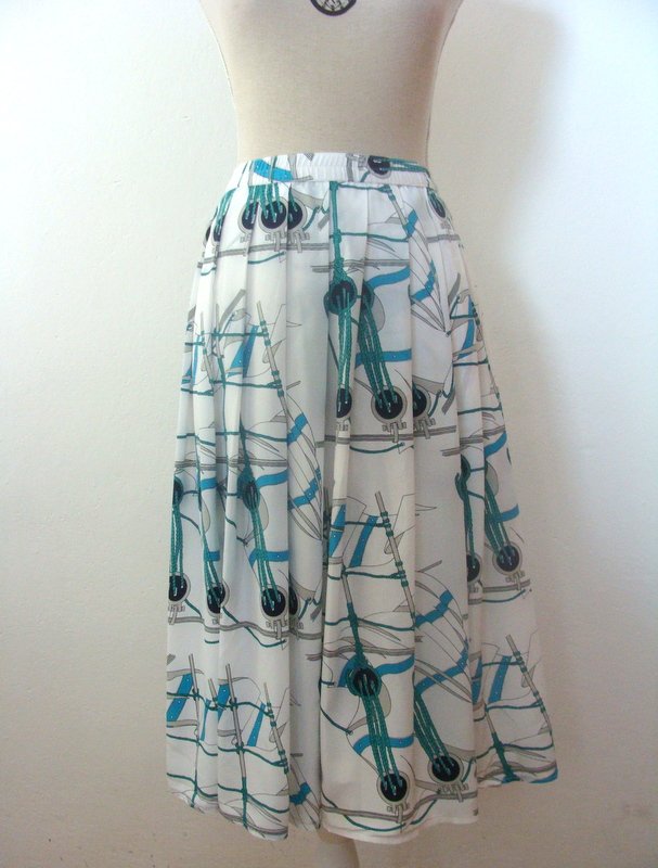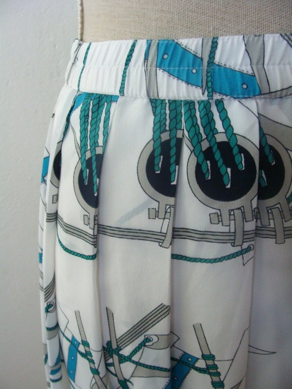 Wzorzysta spódnica z miłej tkaniny poliestrowej z wzorami w chłodnych kolorach szmaragdowej i morskiej zieleni, szarości i czerni na białym tle. Marszczona zakładkami , które można zaprasować na plisy, na gumie w pasie. Na białej podszewce.