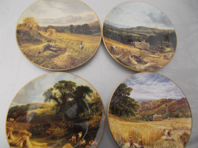 Cztery Talerze / Seria z czterech złożona/ Kolekcjonerskie Talerze. Sygnowane jakością ROYAL DOULTON English Bone China spelniające stanadardy The Bradford Exchange. Z limitowanej / tylko 14. 500 talerzy/ edycji.YEAR OF PLENTY by GEORGE VICAT COLE RA. Wszystkie mają bardzo niskie numery seryjne,oraz każdy posiada swój indywidualny numer na Międzynarodowej Liście Talerzy Kolekcjonerskich BRADEX. Szlachetna Porcelana, dziurki do powieszenia - świadczące o jakości...doskonałe malarstwo i fantastyczne wykonanie.Ranty delikatnie złocone, wykończenie błyszczące...kolory malarsko dobrane, stonowane,letnio-ciepłe...Malatura jakościowa, pięknie malarsko pokazana romantyczna sielsko-wiejsko sceneria.Fantastyczna dekoracja ścienna