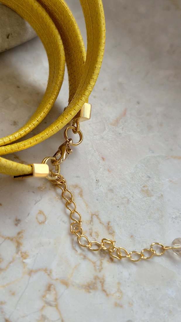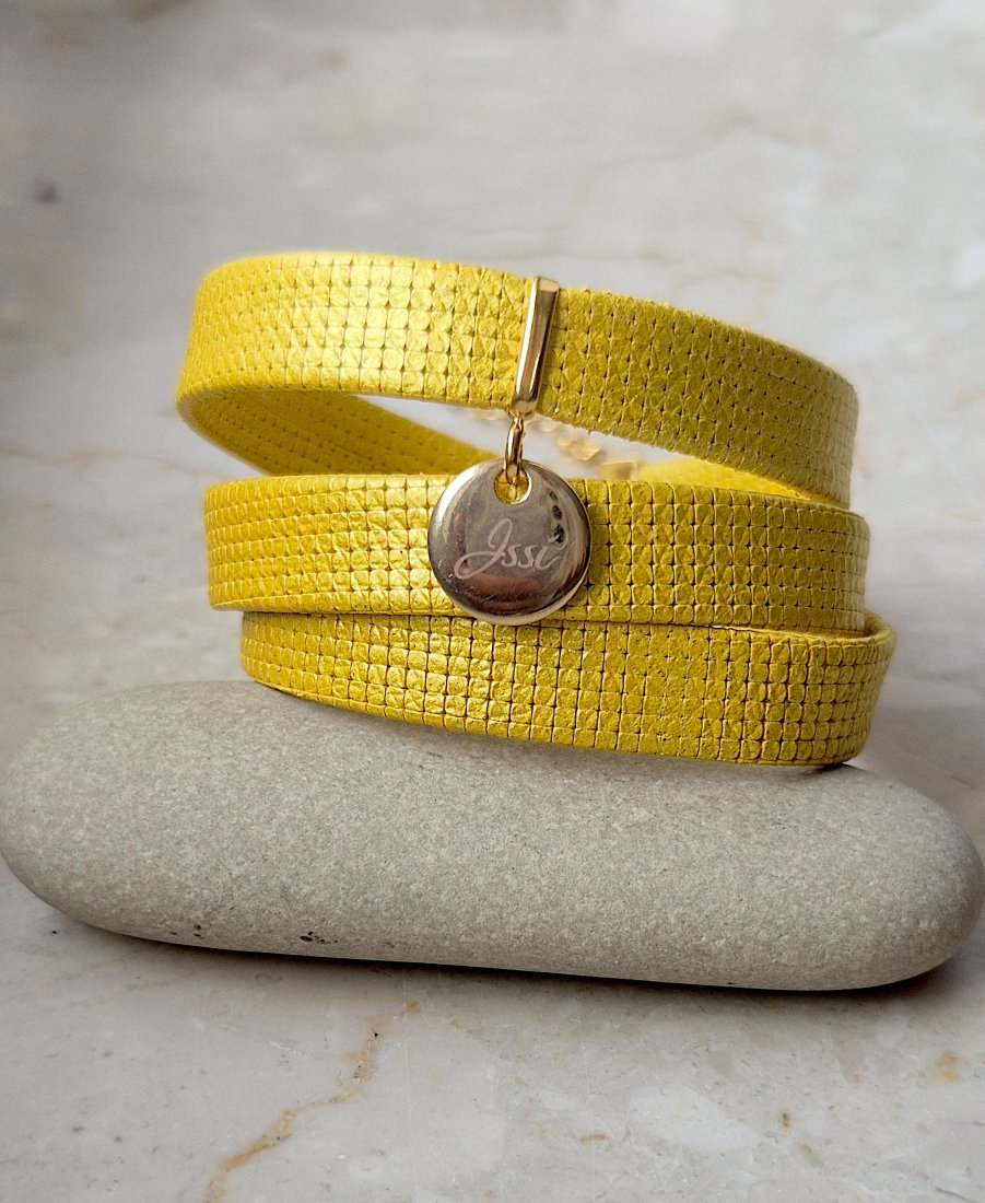 Bransoletka trzykrotnie owijana wokół nadgarstka. Wykonana z najwyższej jakości skory naturalnej (szerokość rzemienia 10mm), lakierowanej, tłoczonej w oryginalny wzór oraz srebra próby 925 pokrytego 24K złotem. Kolor żółty.