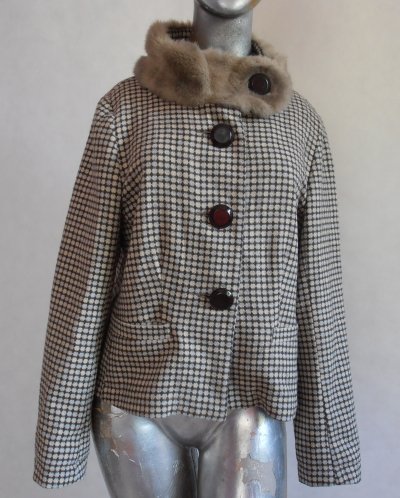 Kurtka krótka,bez ocieplenia,firmy YESSICA.Rozmiar 40.Materiał akryl + wełna + poliester.Zapinana z przodu na duże ,brązowe guziki.W koło szyi wysoka stójka,obszyta sztucznym futerkiem.W dole dwie,wpuszczane do środka kieszonki.Z tyłu na środku wszyty pasek.Rękaw długi,prosty.Stan bardzo dobry.Długość 54 cm.pod pachami 104 cm.