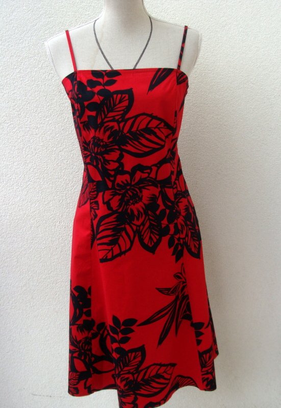 Bawełniana sukienka z wzorem kwiatowym w czerwono-czarnej kolorystyce, na cienkich regulowanych ramiączkach. Taliowana , rozszerzana do dołu. Zapinana z boku na zamek .Tkanina lekko rozciągliwa.