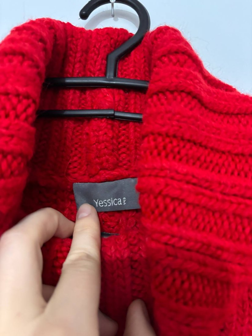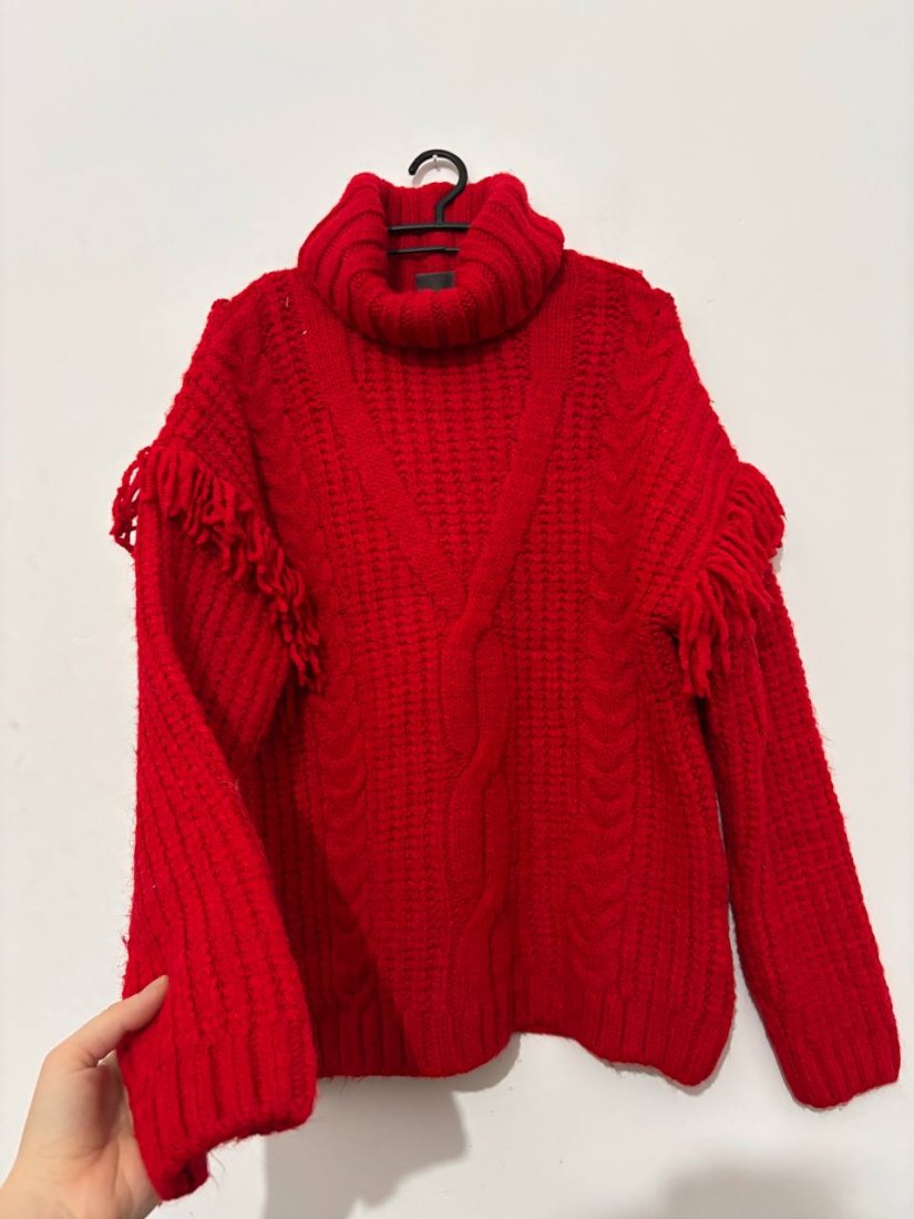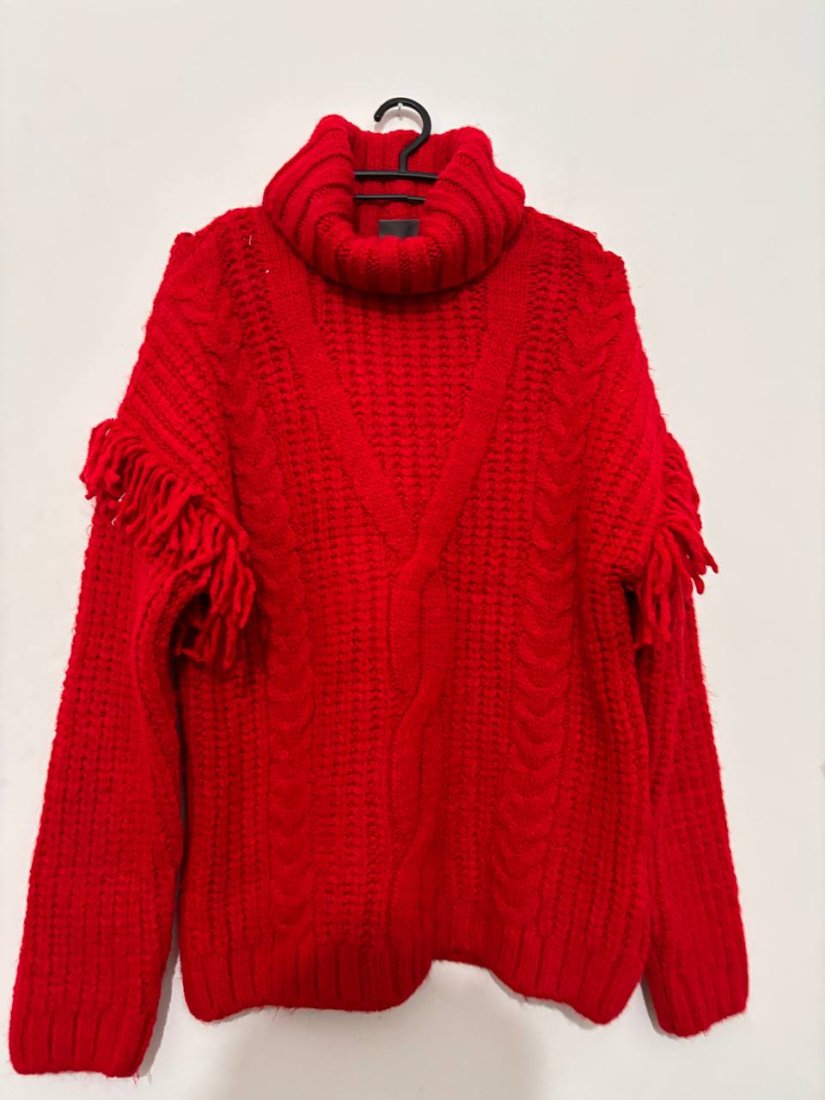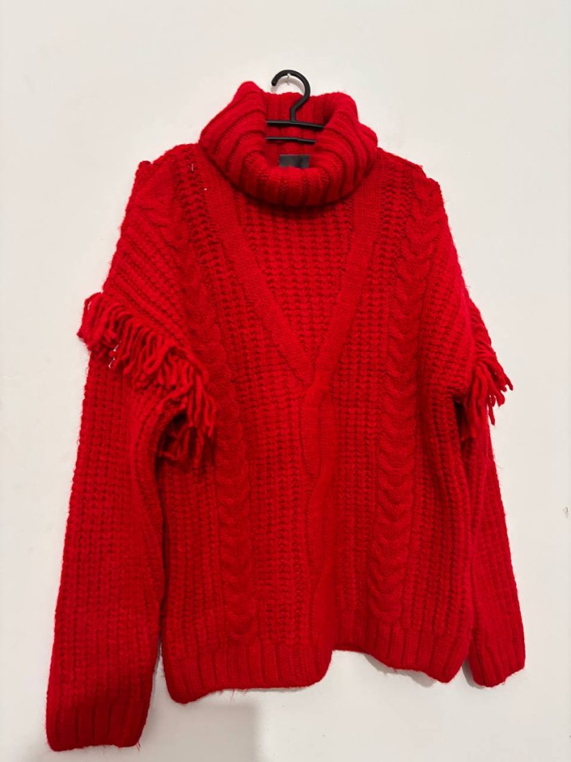 Warmy czerwony sweter marki Yessica o wyjątkowym kroju: głęboki golf, ozdobne przeploty oraz frędzle na ramionachю Dzianina gruba, miękka, bardzo przyjemna na zimę. Model oversize, pięknie układa się na sylwetce.