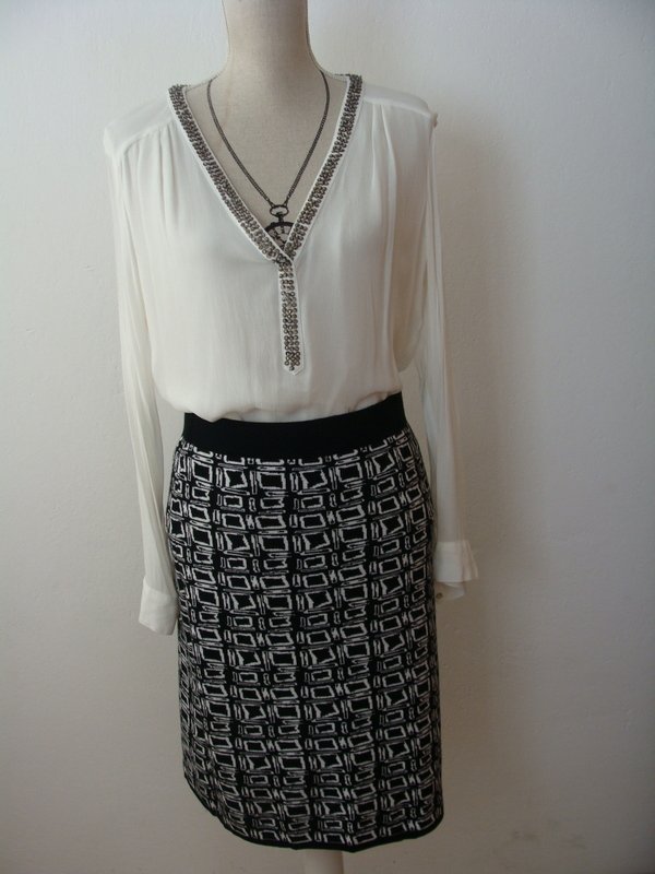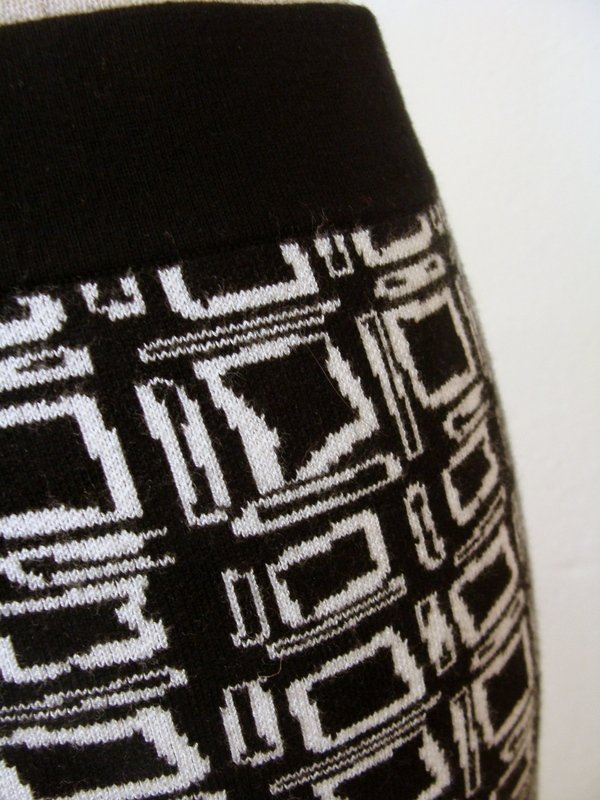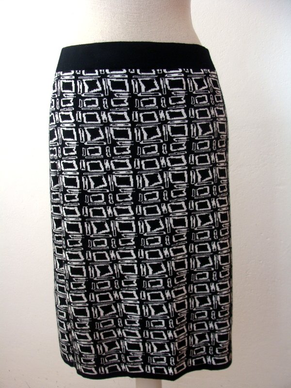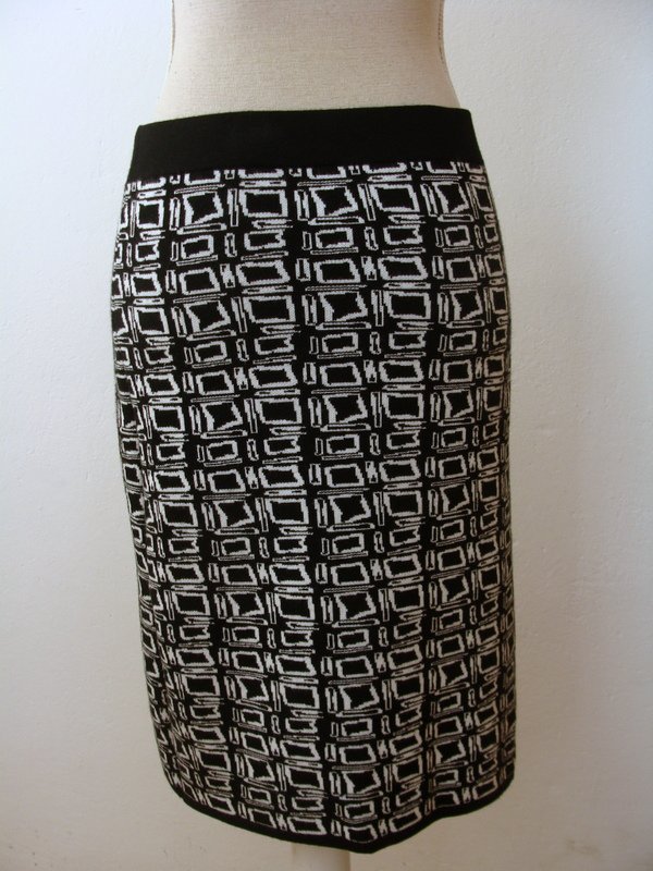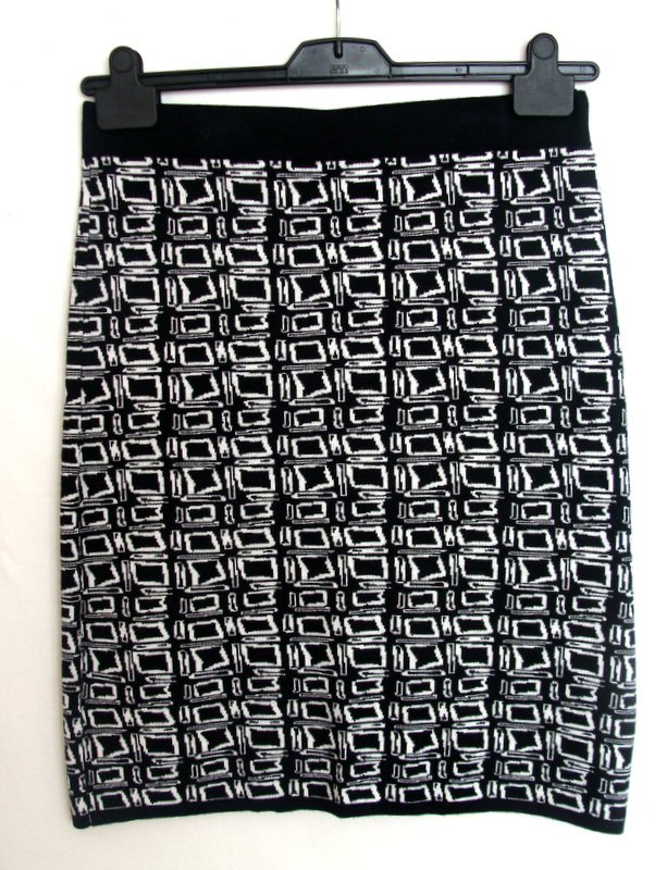 Wiskozowa ołówkowa spódnica z mięsistej dzianiny w czarno - białe wzory , na gumie w pasie. Bez podszewki.