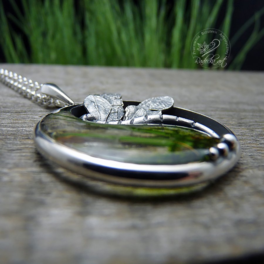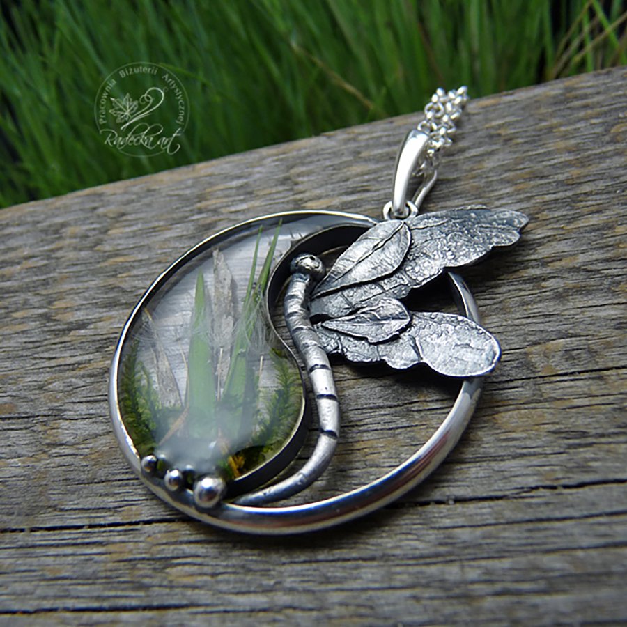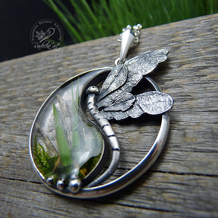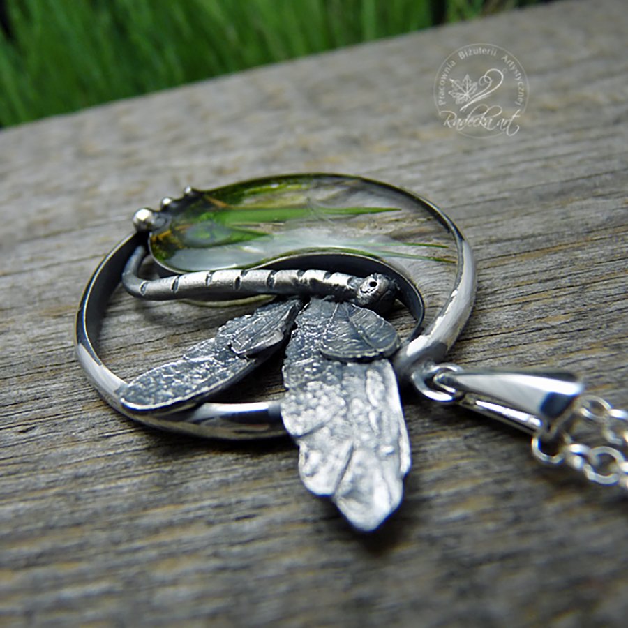 Wisior przedstawiający moją interpretację symbolu "Yin-Yang" został wykonany z oksydowanego srebra, oraz natury lasu zatopionej w wysokiej jakości żywicy epoksydowej. Ten jedyny w swoim rodzaju wisior o średnicy 3,5 cm i wadze 9,5 g został zawieszony na długim, srebrnym łańcuszku o długości 70 cm. Wszystkie moje prace wysyłam w eleganckim pudełeczku jubilerskim. Gorąco polecam.