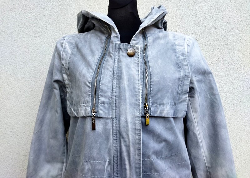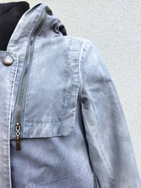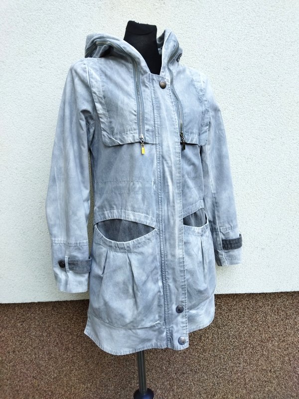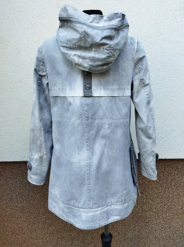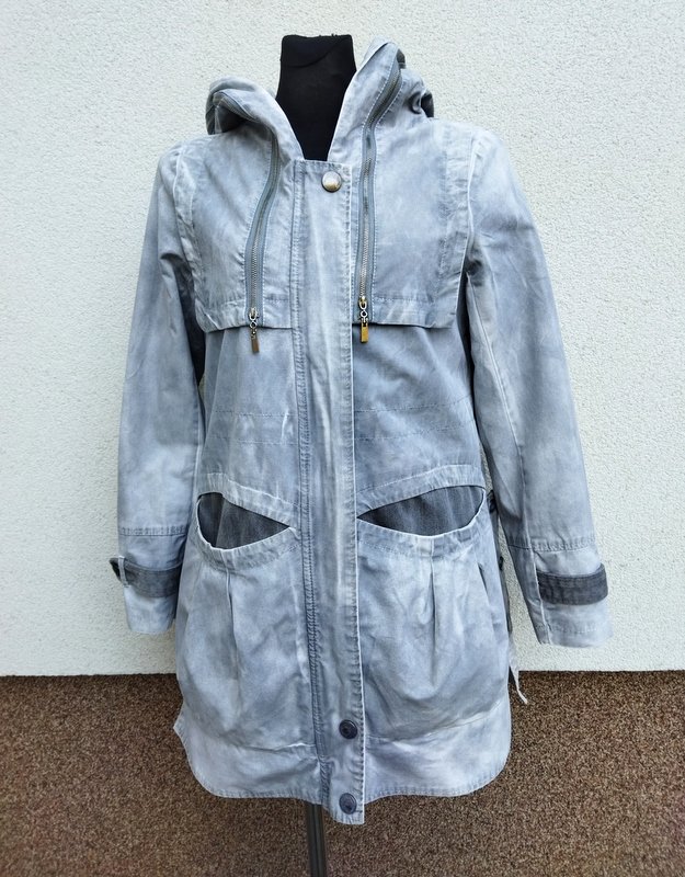 Świetna dłuższa kurtka z grubszej dekatyzowanej tkaniny bawełnianej w odcieniach szarości . Starannie odszyta z licznymi detalami. Z kapturem , z a' la pelerynką, z dwiema naszywanymi kieszeniami, z rozcięciami po bokach zapinanymi na zamki ukryte pod patkami zapinanymi na napy, z patkami na mankietach rękawów. Zapinana na zamek ukryty pod plisą zapinaną na napy. Na podszewce.