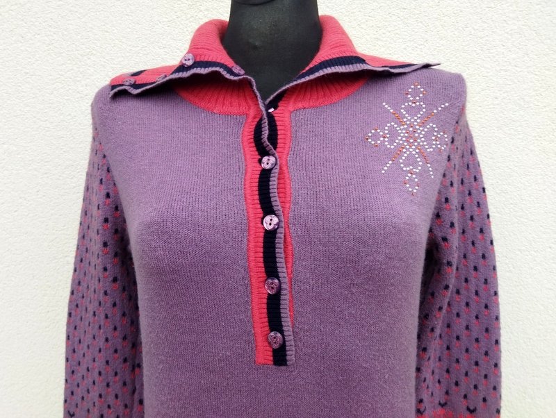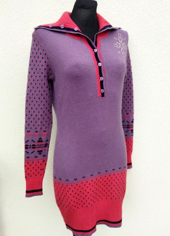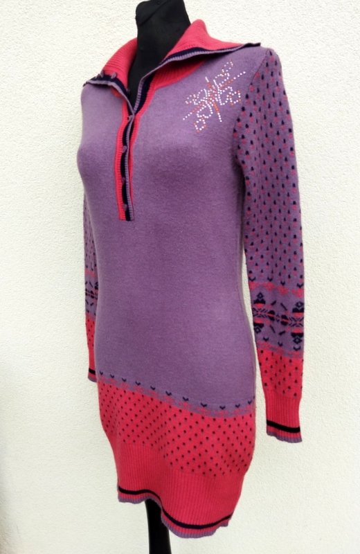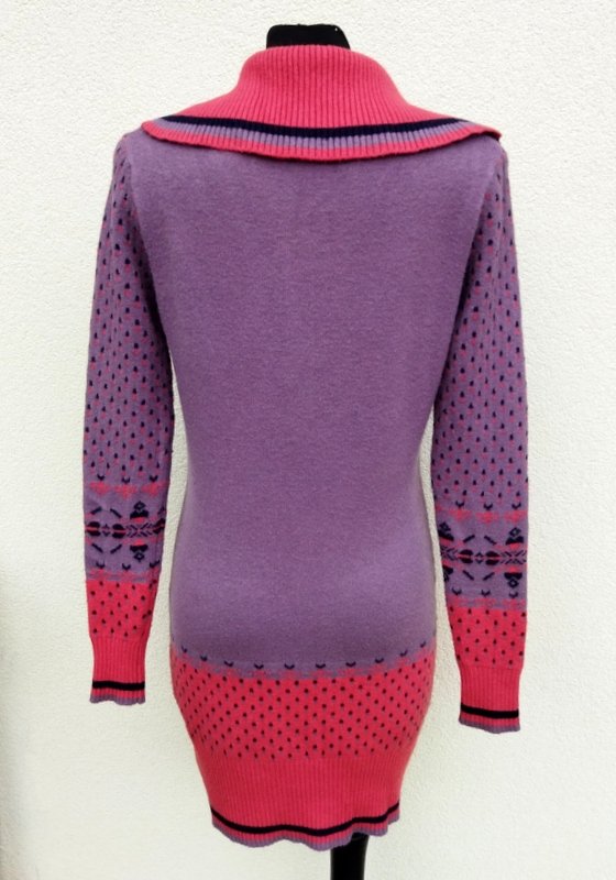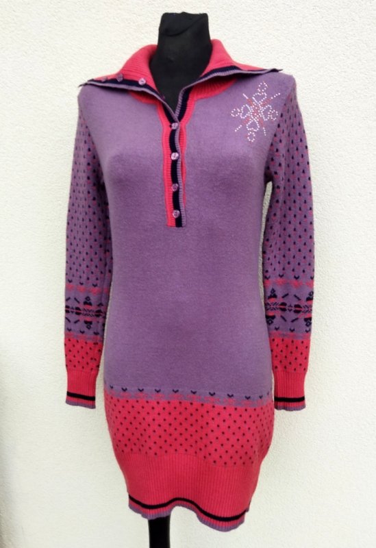 Miła rozciągliwa sukienka w zgaszonym fioletowym kolorze z z wzorami w czerni i truskawkowej czerwieni. Z rozcięciem z przodu zapinanym na małe guziczki i kołnierzem , który można zapiąć jako golf. wykończona ściągaczami.