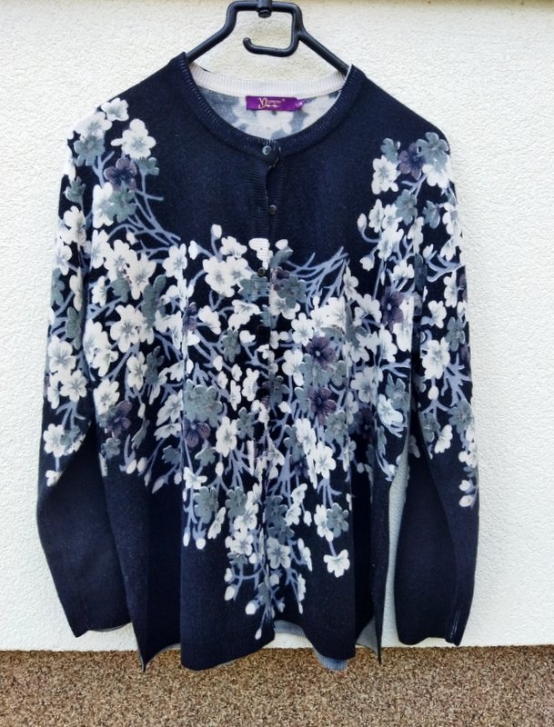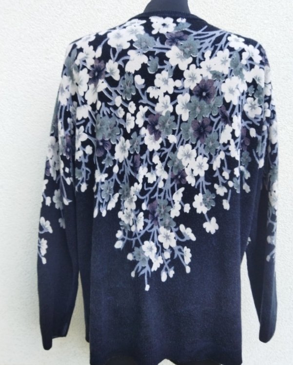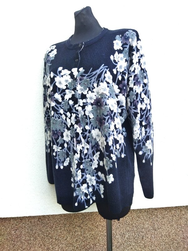 Akrylowo-wełniany sweter typu kardigan z kwiatowym wzorem w kolorach złamanej bieli, rozwodnionej zieleni, gołębiej szarości i cappuccino na czarnym tle. Zapinany na całej długości na małe guziczki. Wykończony ściągaczami